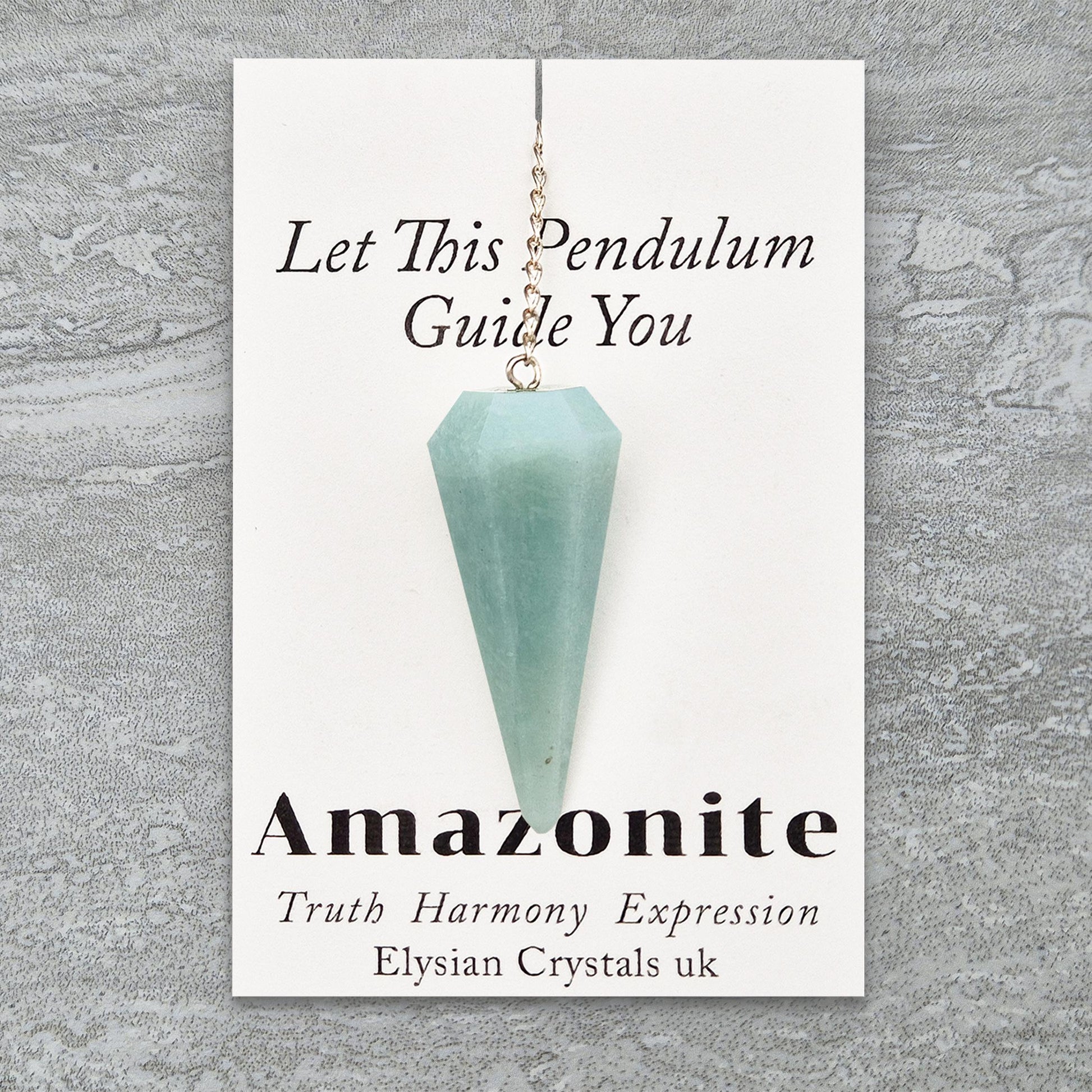 Amazonite Crystal Pendulum. This Amazonite crystal pendulum features a smooth Amazonite stone with a clear bead at the end of the chain. It comes with a pouch for safe keeping.