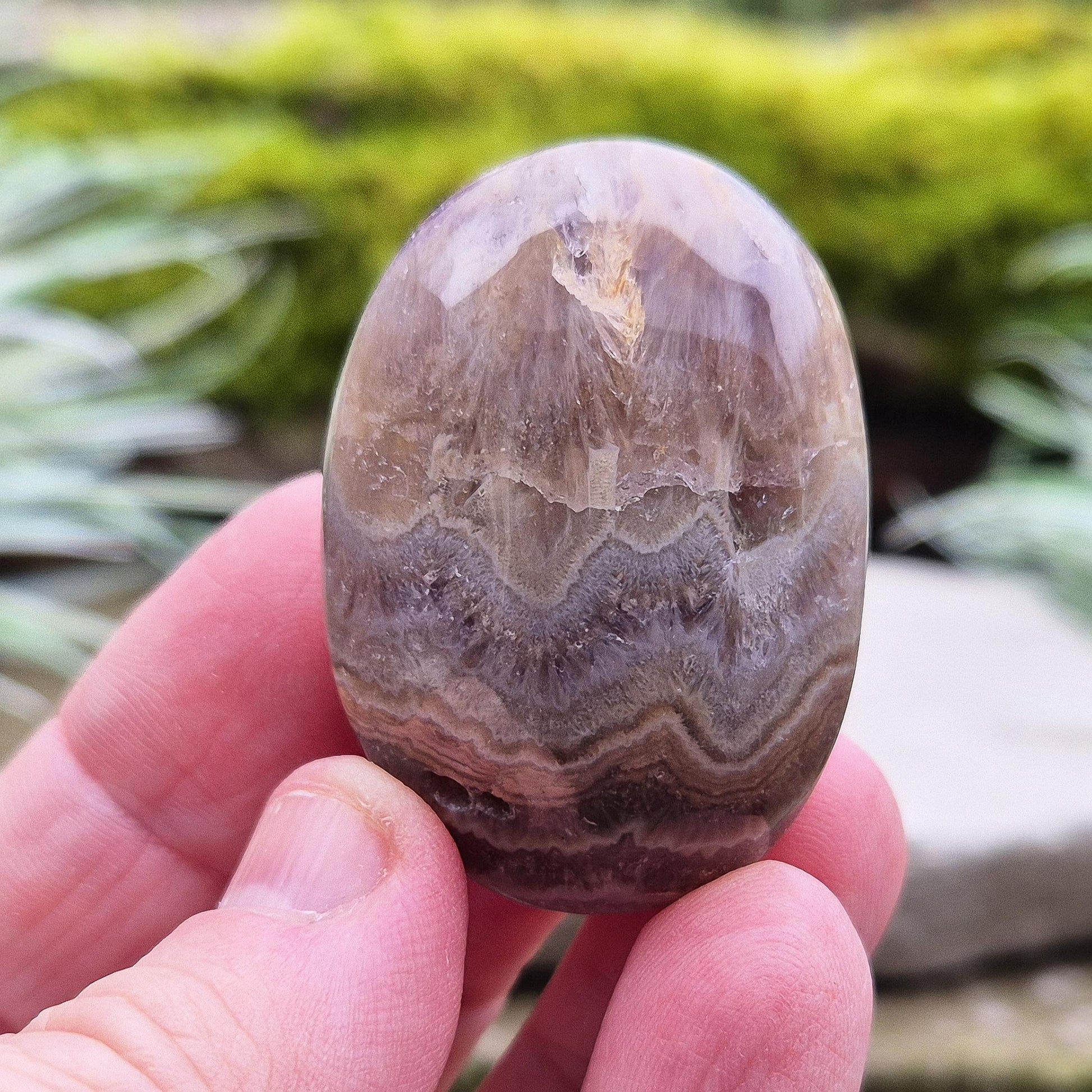 This beautiful Amethyst and Jasper palm stone features a natural fusion of calming Amethyst and grounding Jasper.