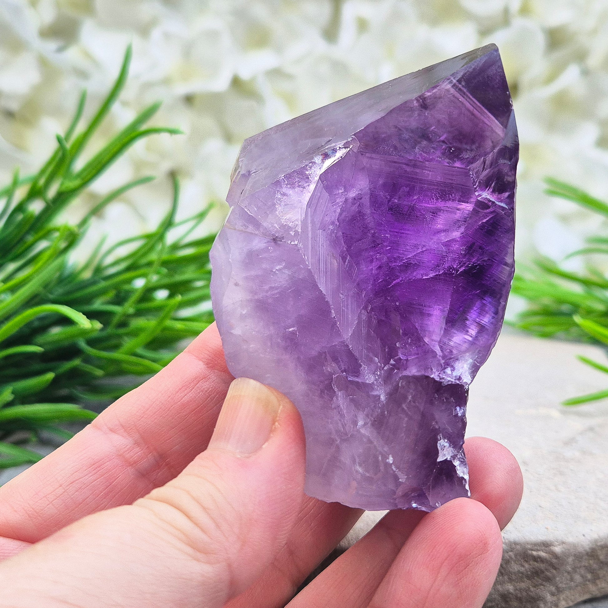 This deep purple Amethyst standing point features a polished tip, natural sides, and a cut base so it stands on its own. Many people are drawn to Amethyst during stressful periods, emotional ups and downs, or when life feels mentally overwhelming. Points like this are often chosen for personal spaces because they offer a sense of peace and calm. A piece people reach for when they want their environment — or headspace — to feel quieter, steadier, and more supportive.