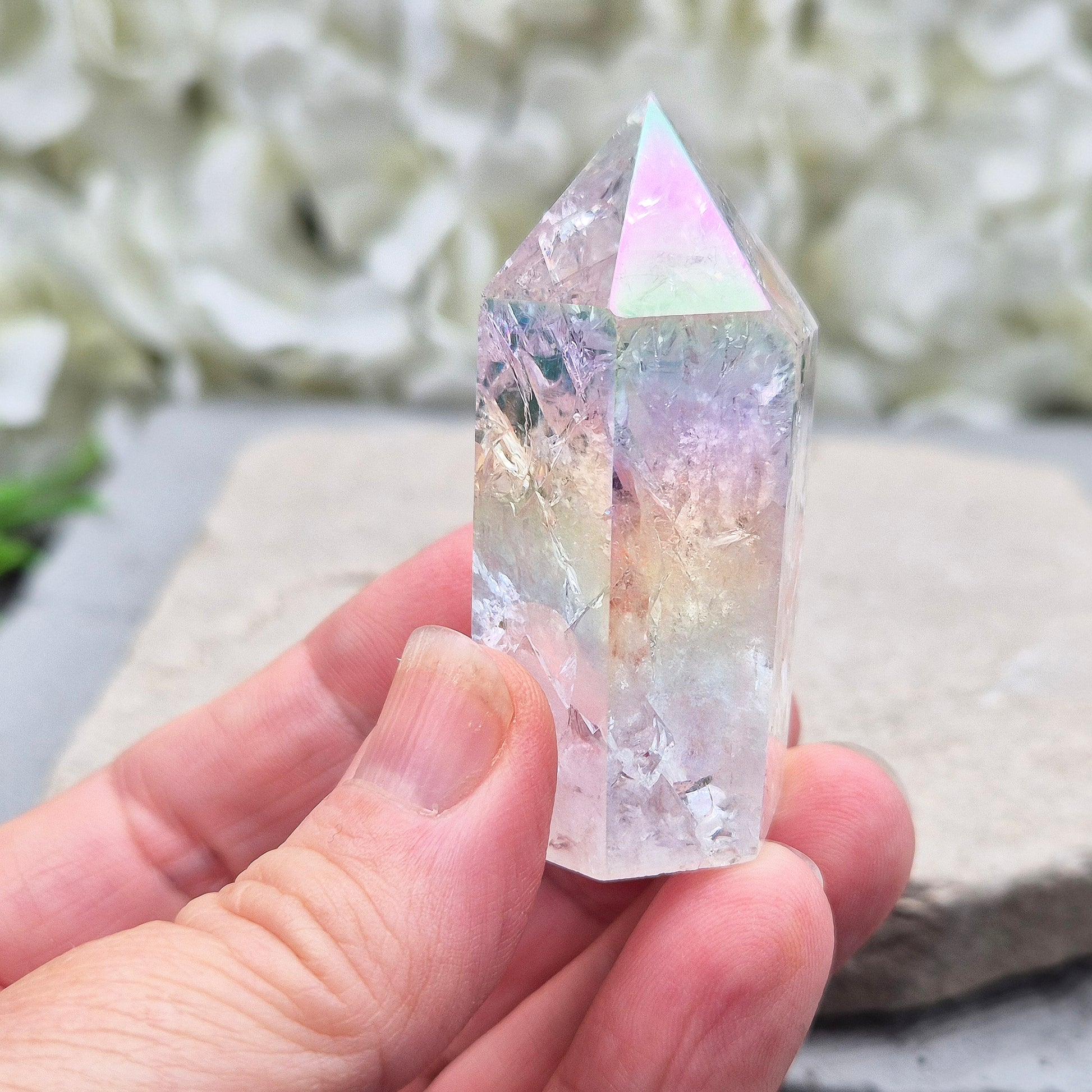 Aura Fire and Ice Quartz Polished Standing Point. Formed through the rapid heating and cooling of Quartz, this crystal develops beautiful internal fracturing that catches the light in rainbow flashes. It is then bonded with Silver and Platinum, transforming it into Angel Aura Fire and Ice — a stone often described as radiant, uplifting, and full of light.