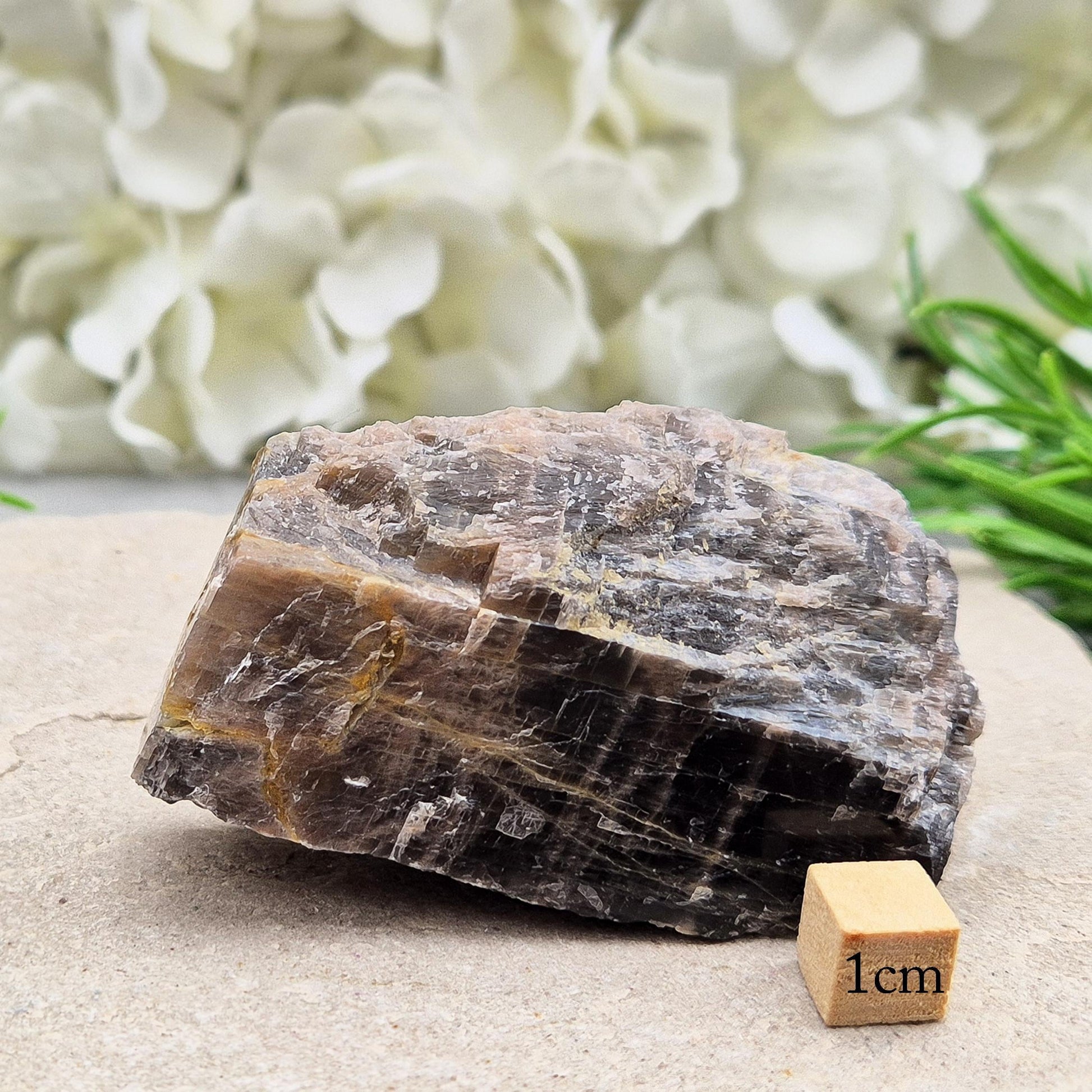 Natural piece of Black Moonstone from Madagascar. It’s a variety of Moonstone known for its dark grey to black tones, often showing subtle flashes of silver, peach, or white.