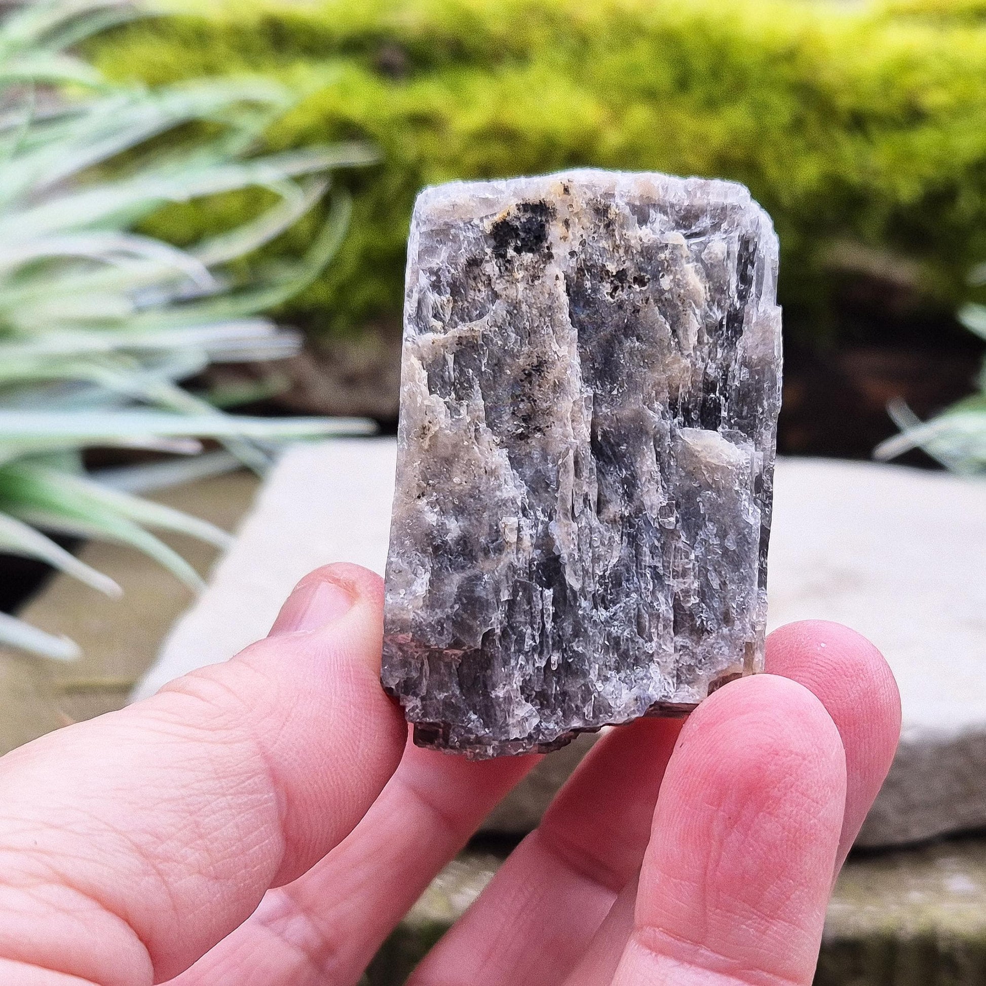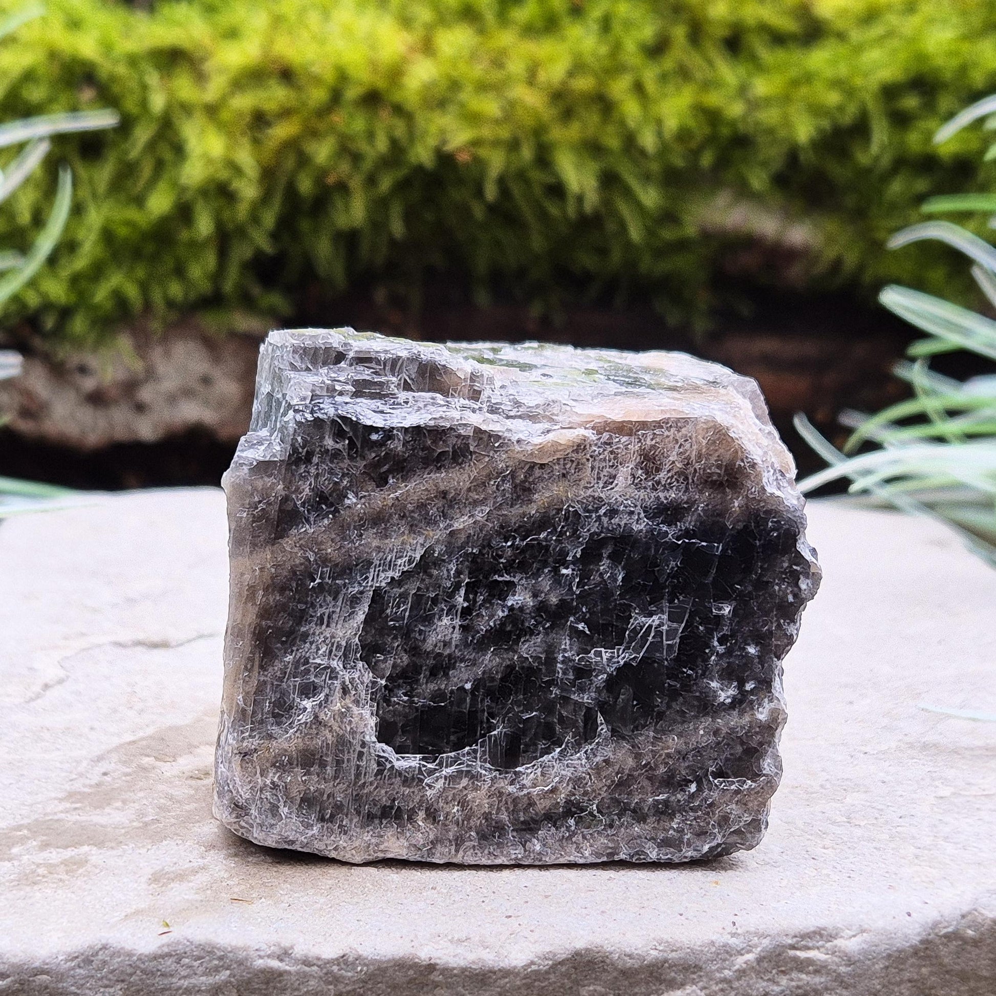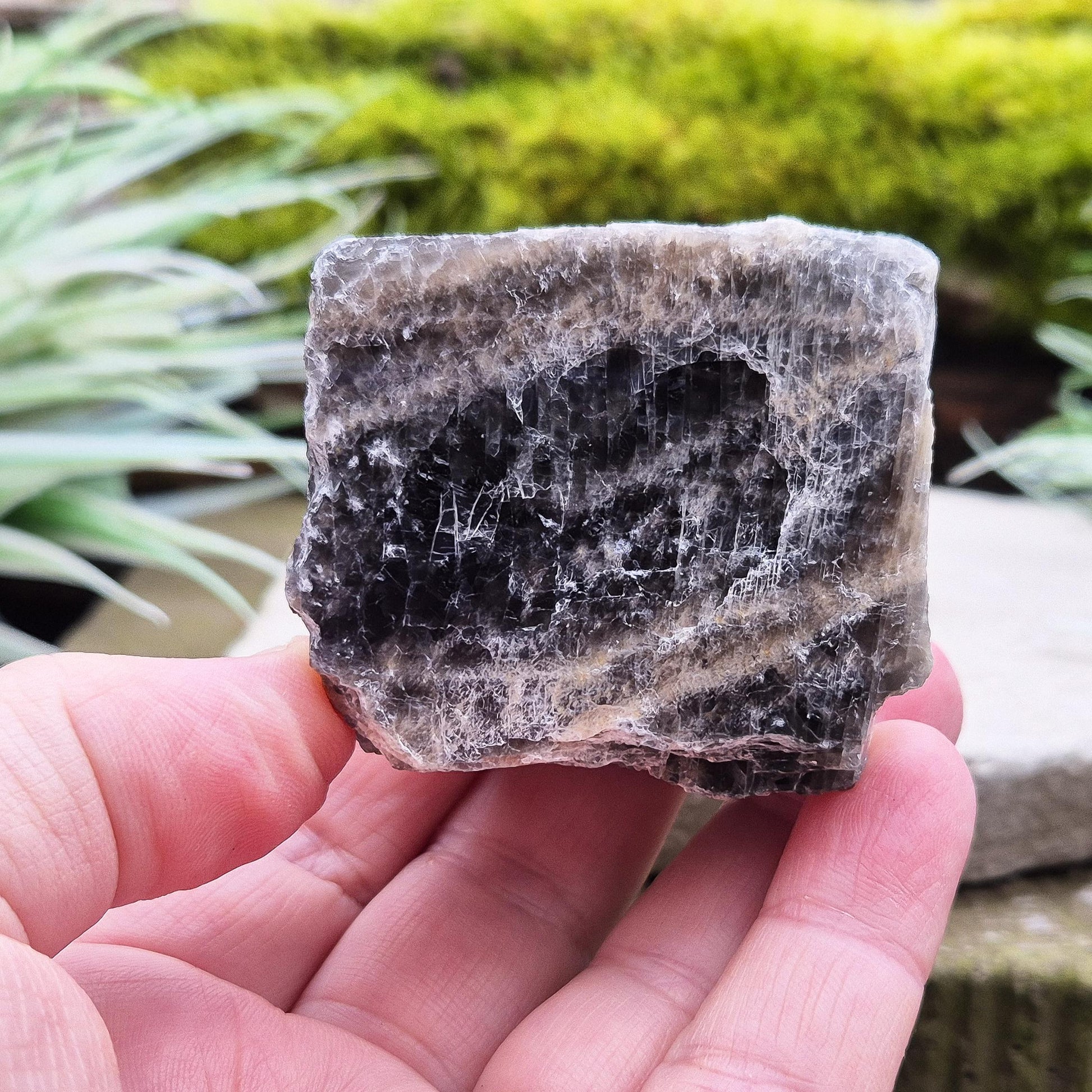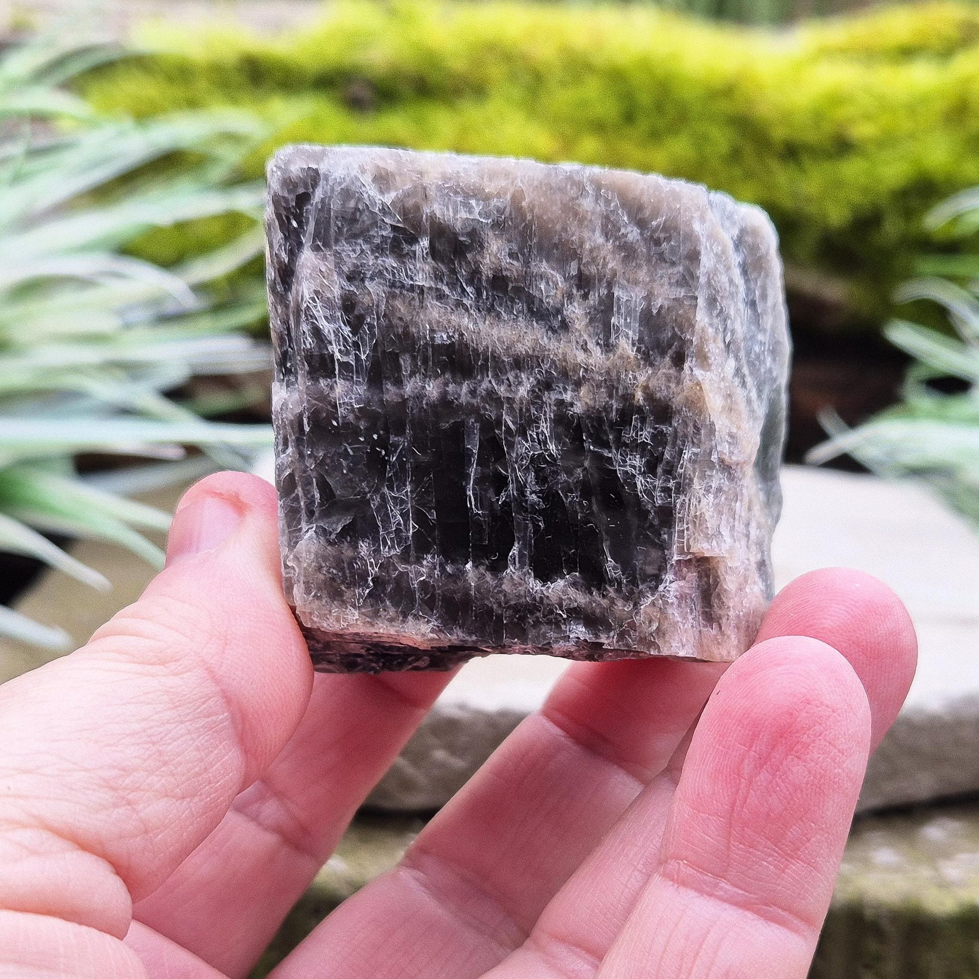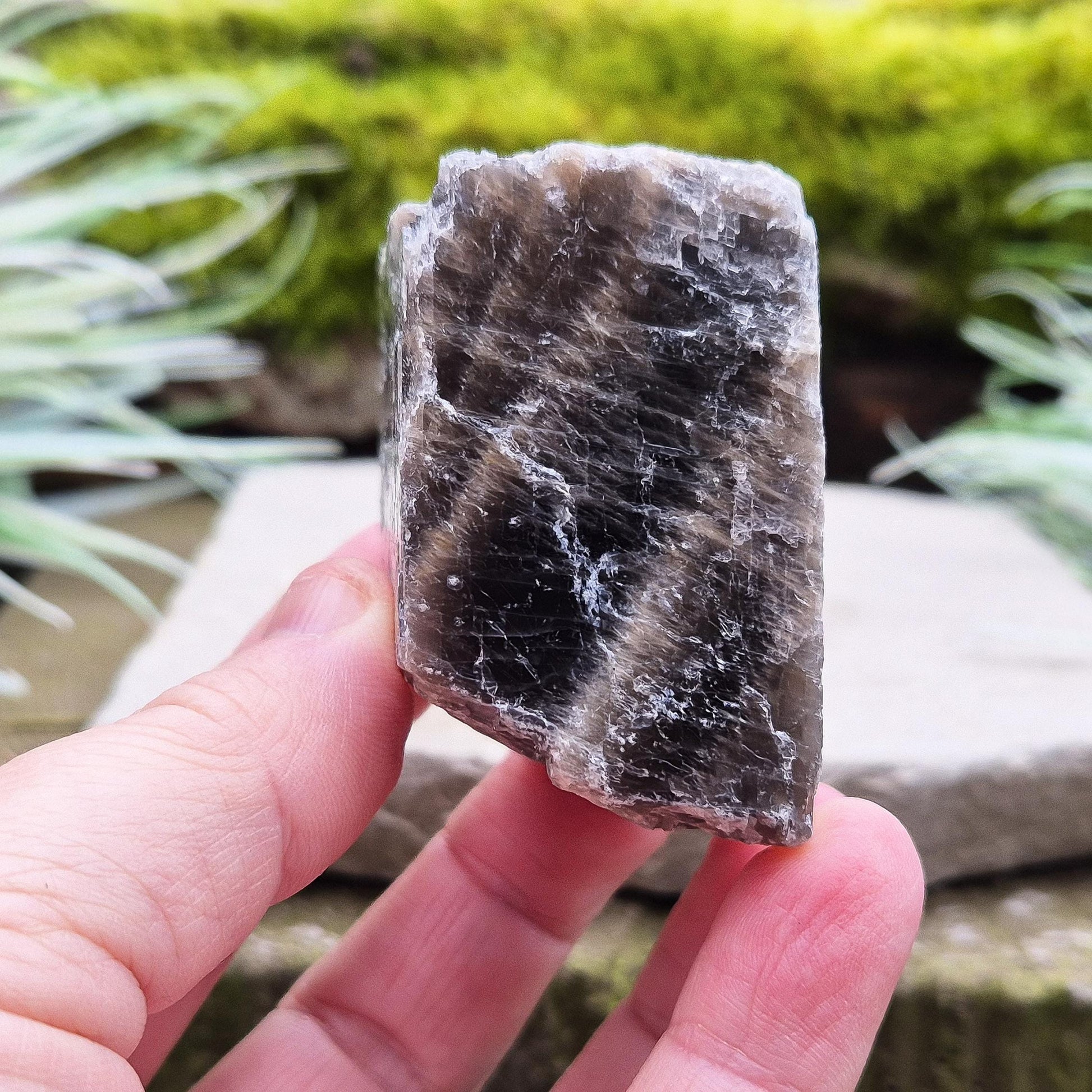 Black Moonstone from Madagascar, natural piece. Black Moonstone is a variety of moonstone that features dark shades, often with a subtle shimmer. It is typically found in deep gray, black, or brown hues with flashes of silver, peach, or white.