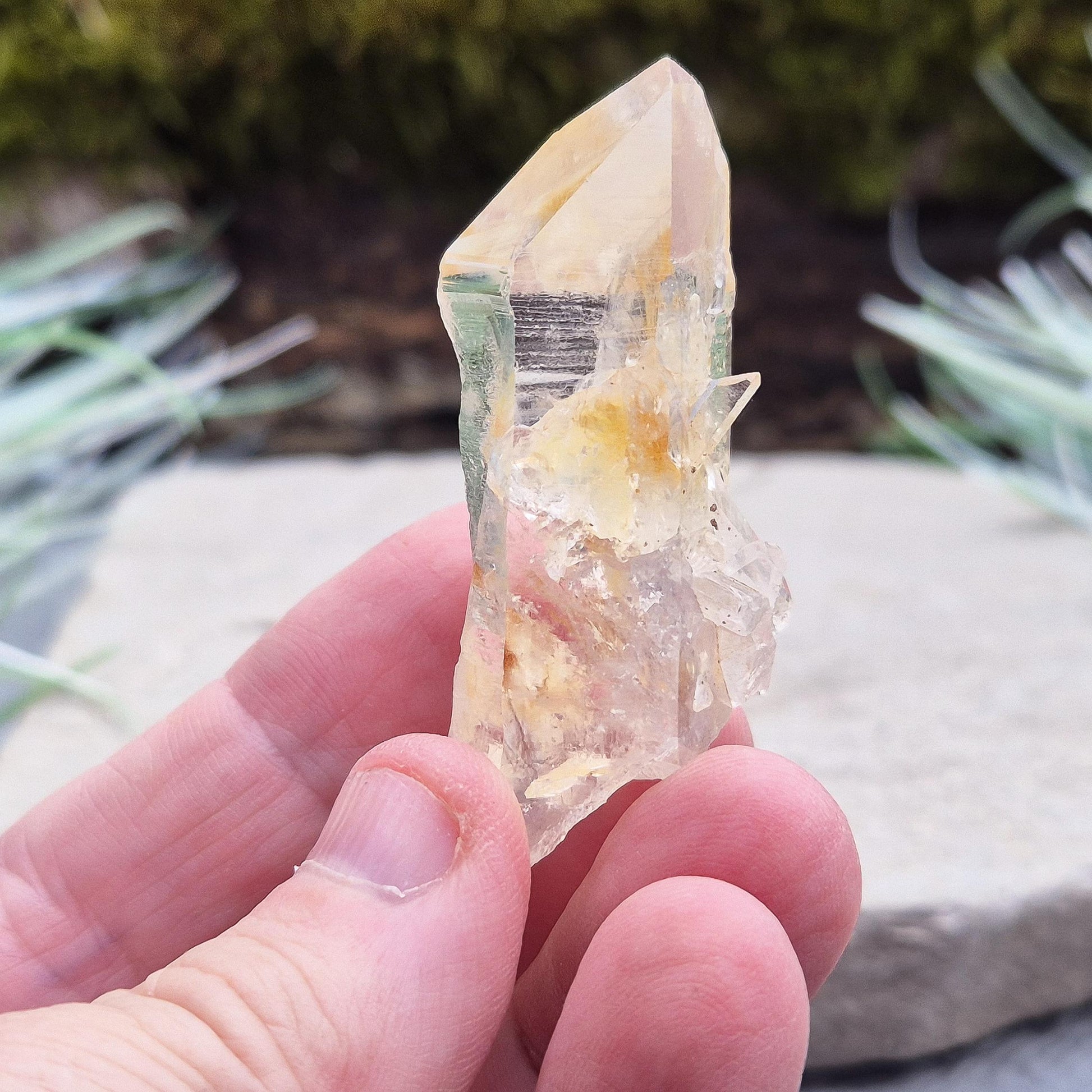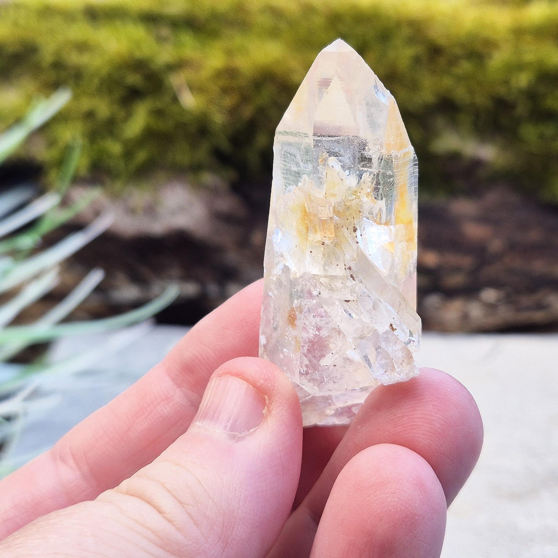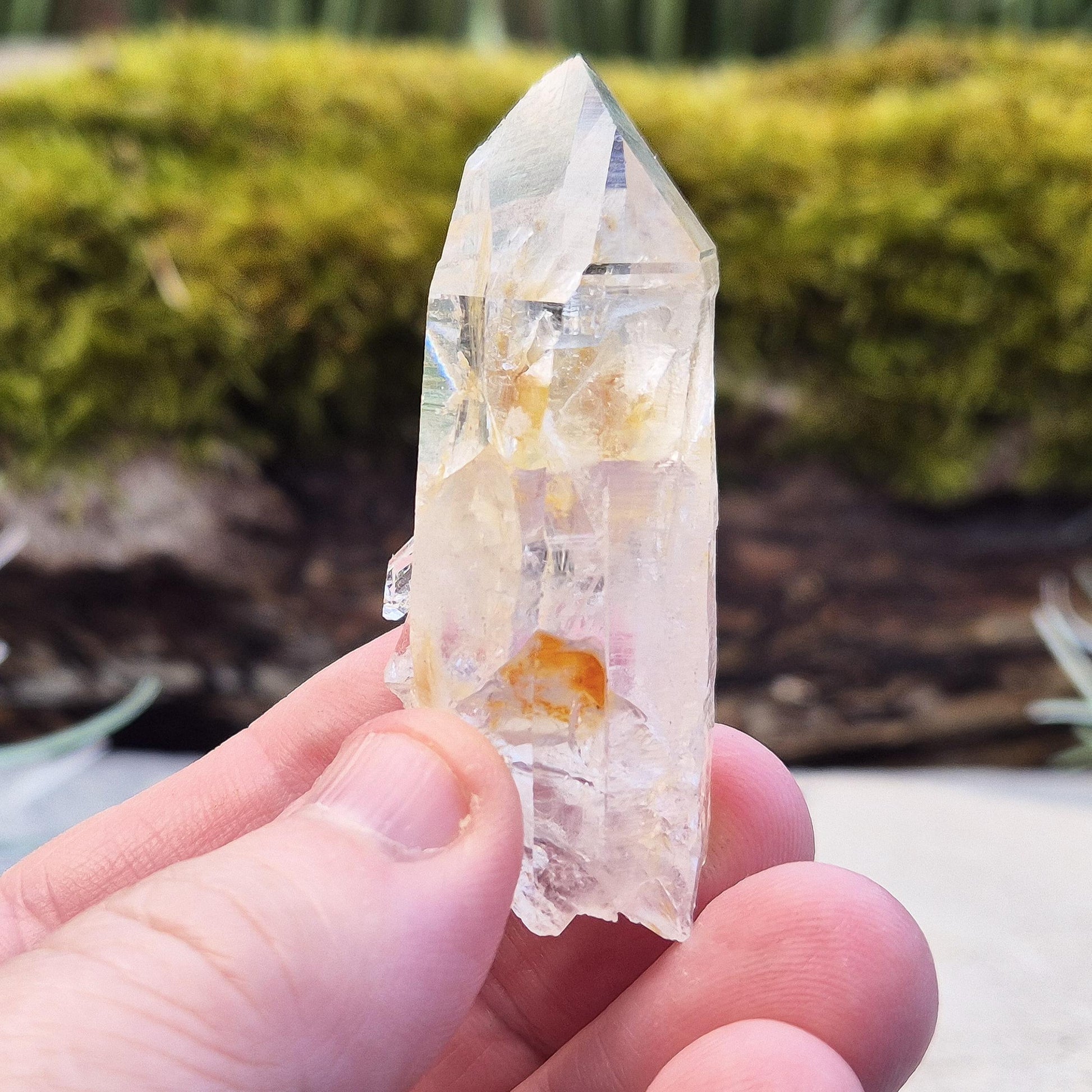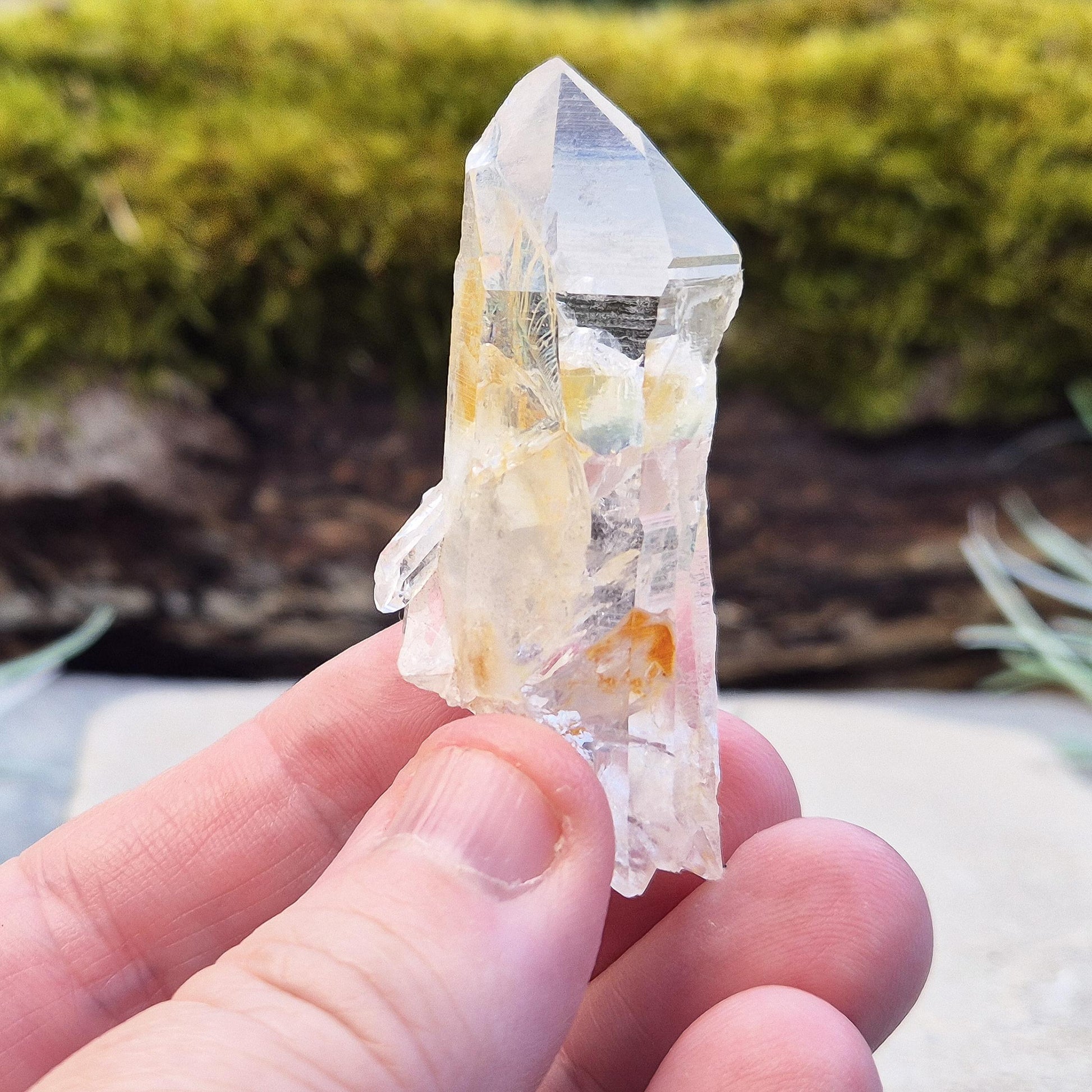 This rare Blade of Light Quartz is a striking Lemurian Quartz from the mountains of Colombia. Known for its exceptional clarity and natural brilliance, this piece features a point that has a few smaller crystals growing out of/into it. A special addition for crystal collectors and those drawn to unique, high-quality stones.