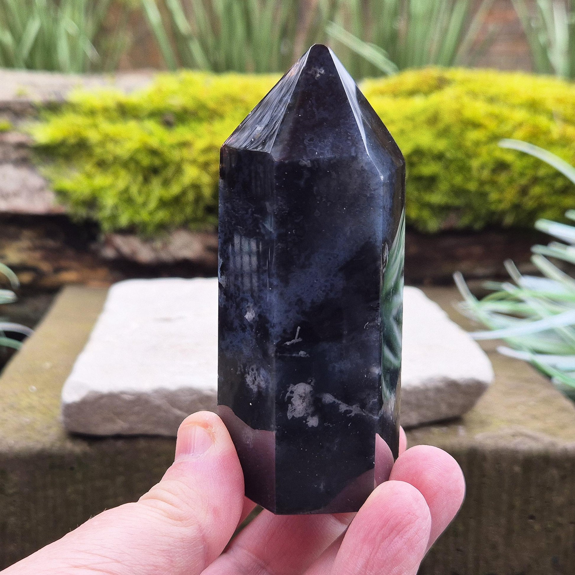 Blue Jasper Polished Point from Brazil. This striking piece features hues of colour from soft sky tones to deep ocean blues. This polished tower is ideal for display, mindful decor, or personal crystal practices.