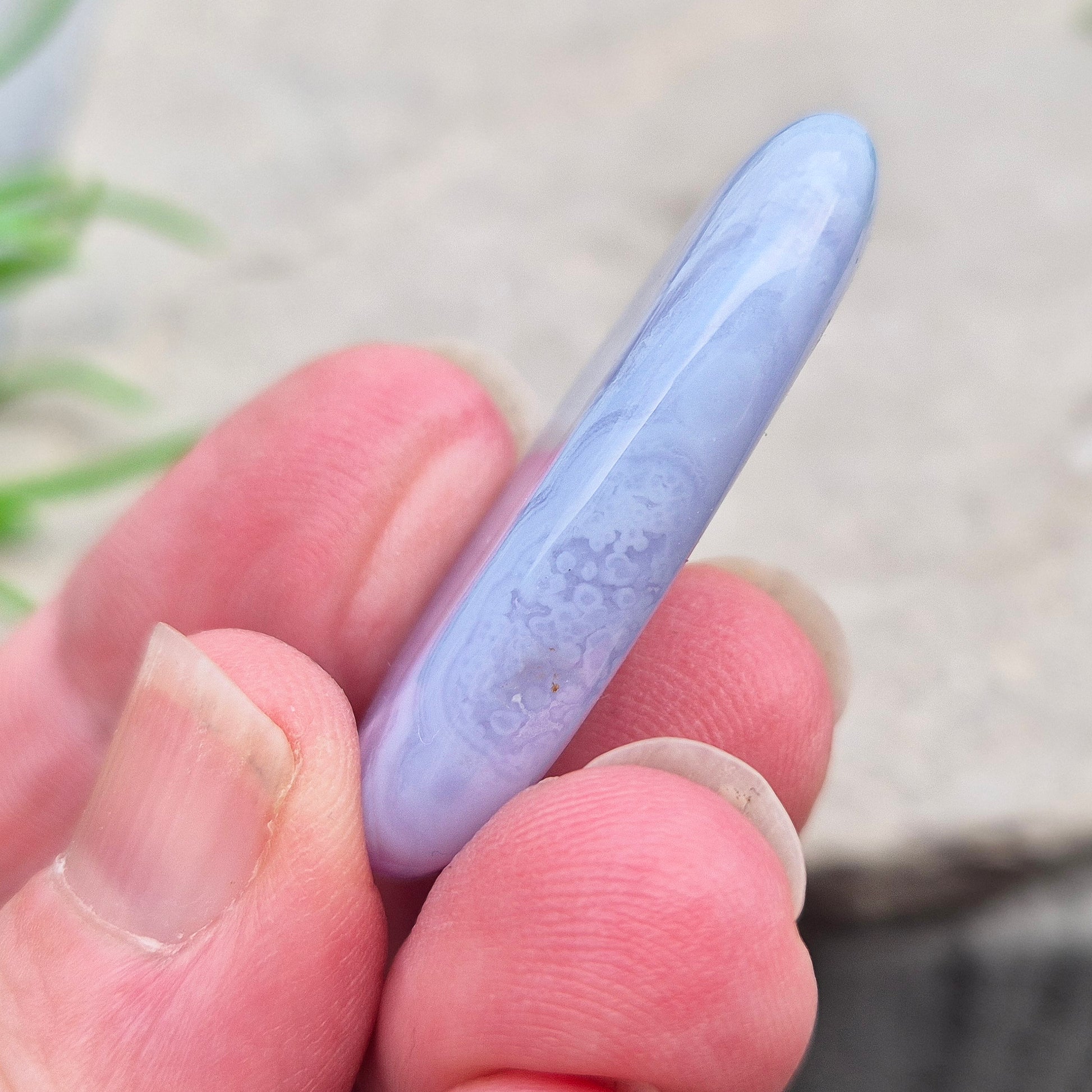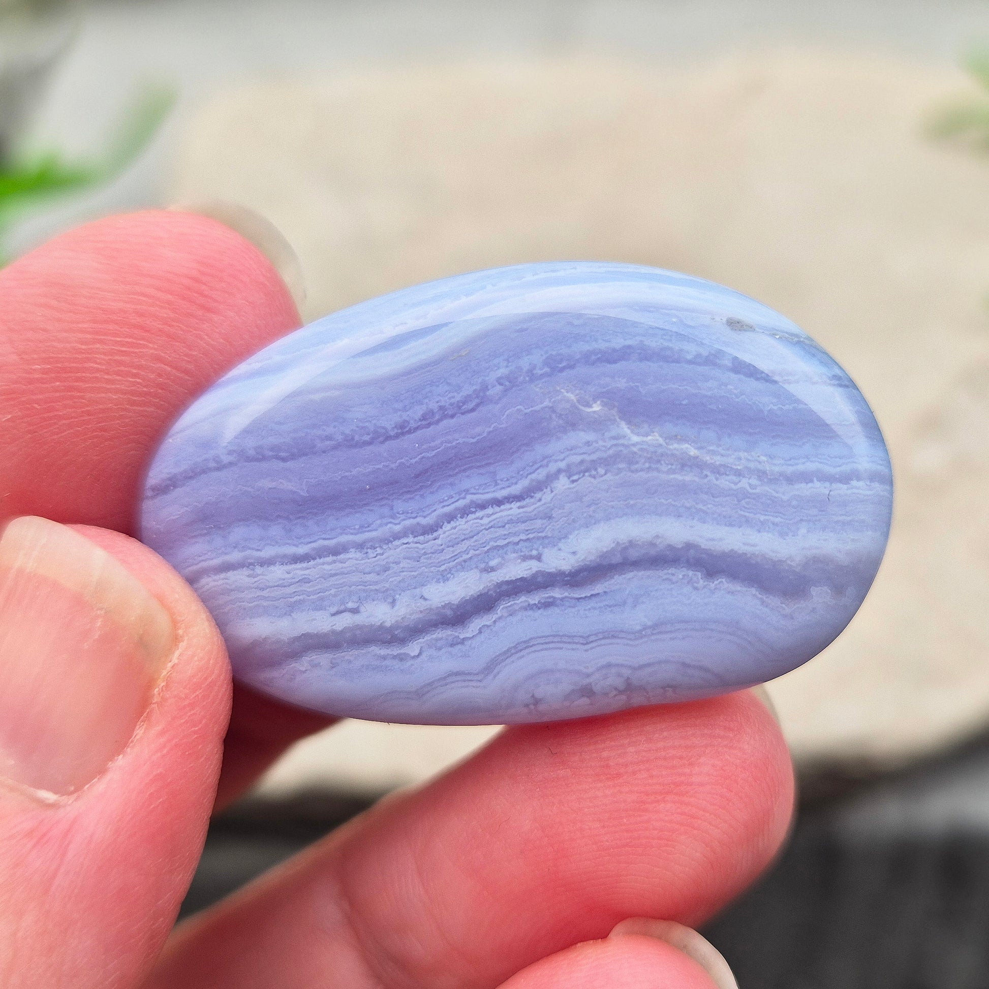 This polished Blue Lace Agate palm stone from Namibia is shaped to sit comfortably in the hand, with soft blue banding and a naturally calming energy that flows straight to the heart and throat.