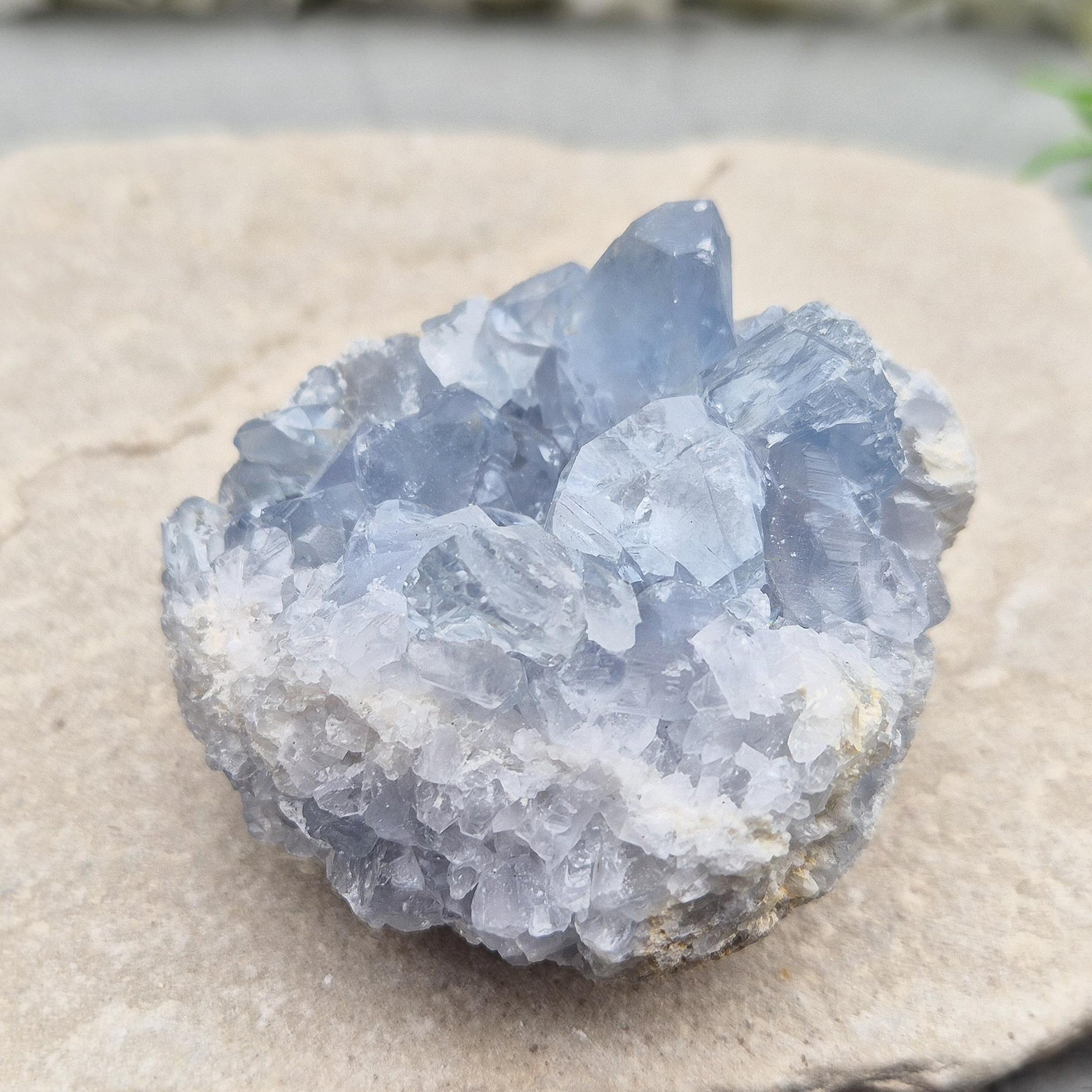 Celestite Crystal Cluster from Madagascar. This beautiful cluster features sparkling sky-blue crystals on a natural matrix. The base is rounded but it will sit on a flat surface. Celestite (also known as Celestine), a high vibration crystal, is loved for its soothing, uplifting energy and its connection with higher guidance and the angelic realm.