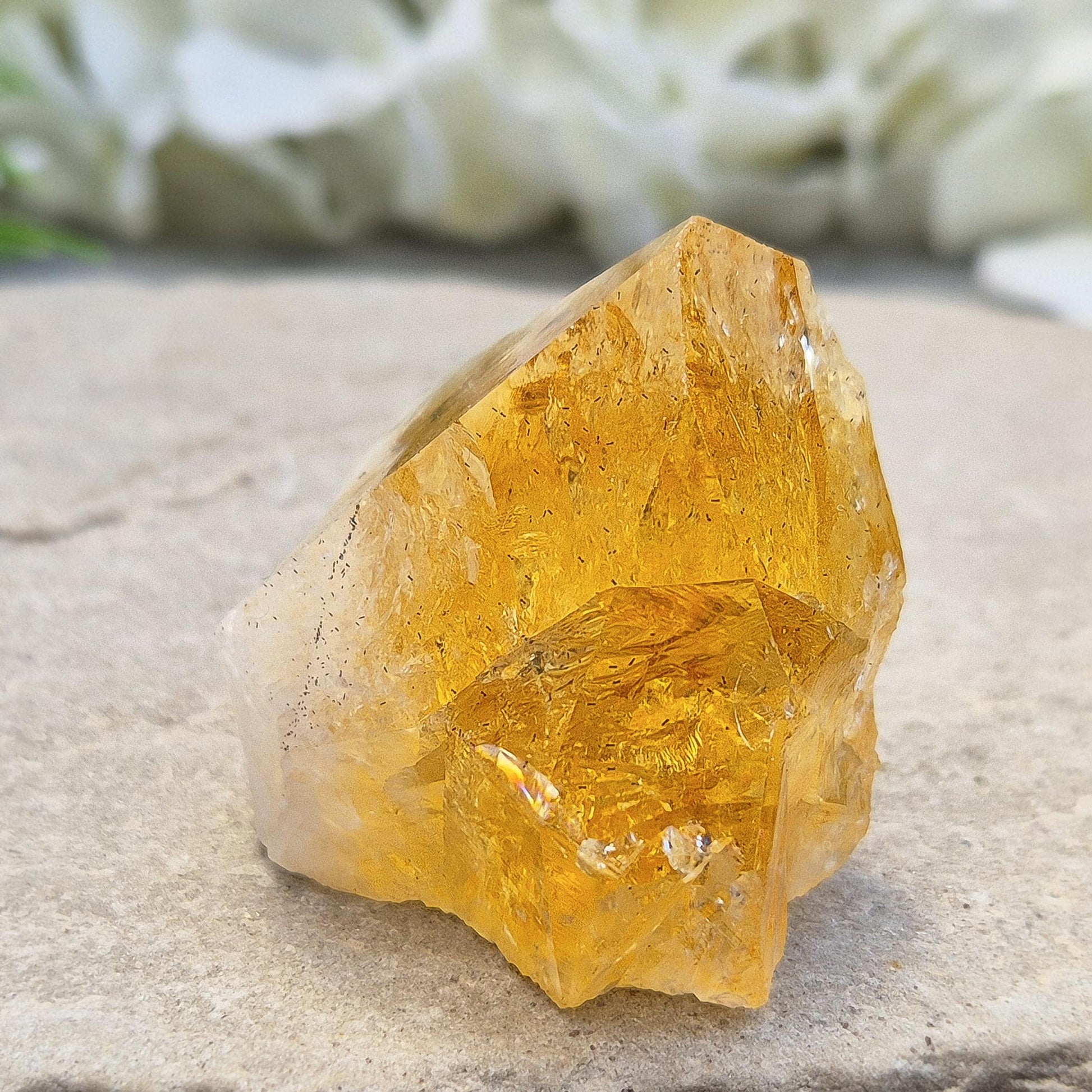 This stunning Citrine Crystal Point has a polished tip with light-catching inclusions and natural sides. With its flat base, it stands beautifully on its own. Citrine is often known as the “stone of joy and abundance,” bringing fresh energy and positivity into your life. With its steady, uplifting vibration, this point is a wonderful companion for boosting confidence, sparking creativity, and encouraging a brighter outlook.