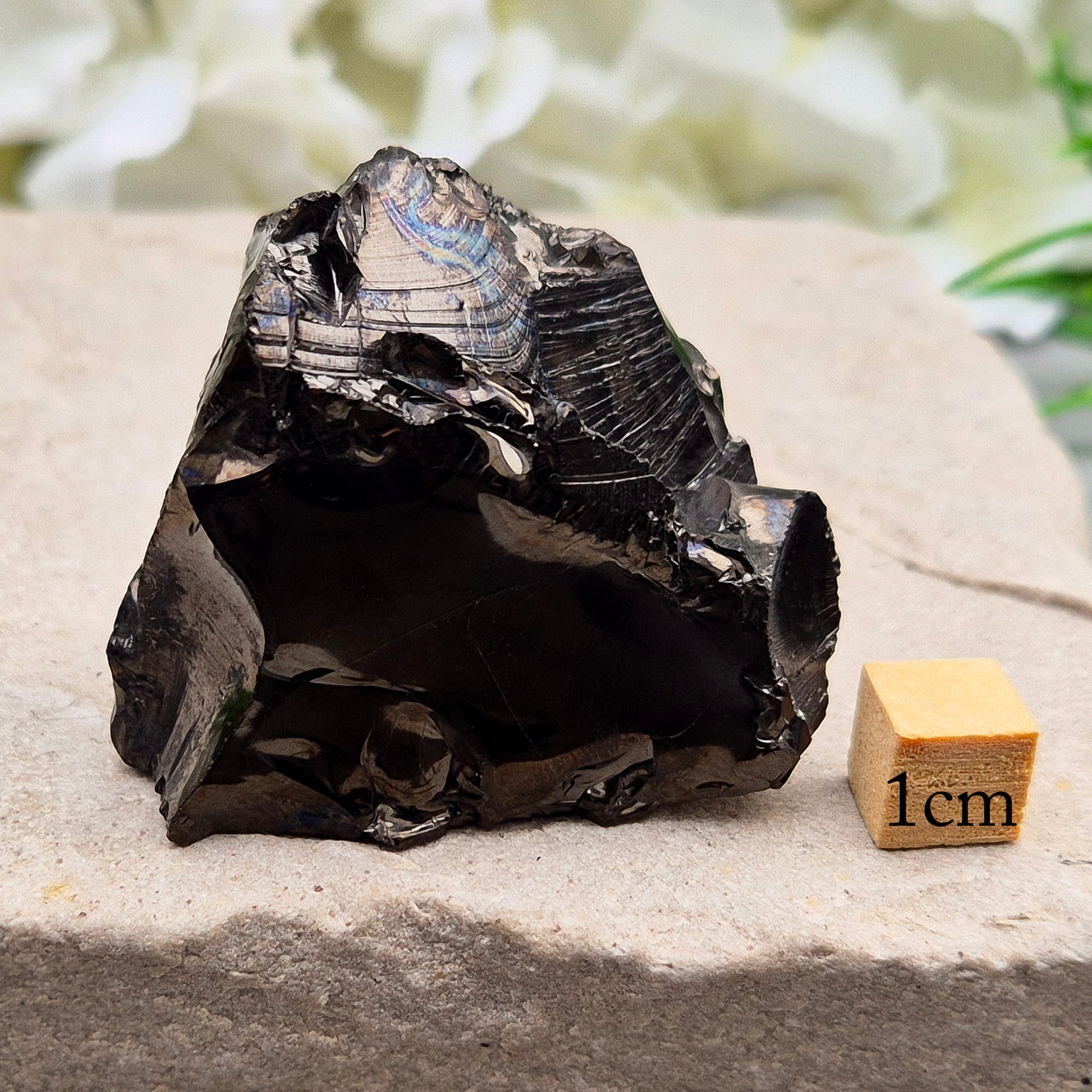 Many pieces from this deposit show a natural rainbow iridescence when the light hits the surface — a thin, naturally formed film created during the stone’s formation. This gives the stone an unusual, oil-slick shimmer while still keeping that deeply grounding black body colour.