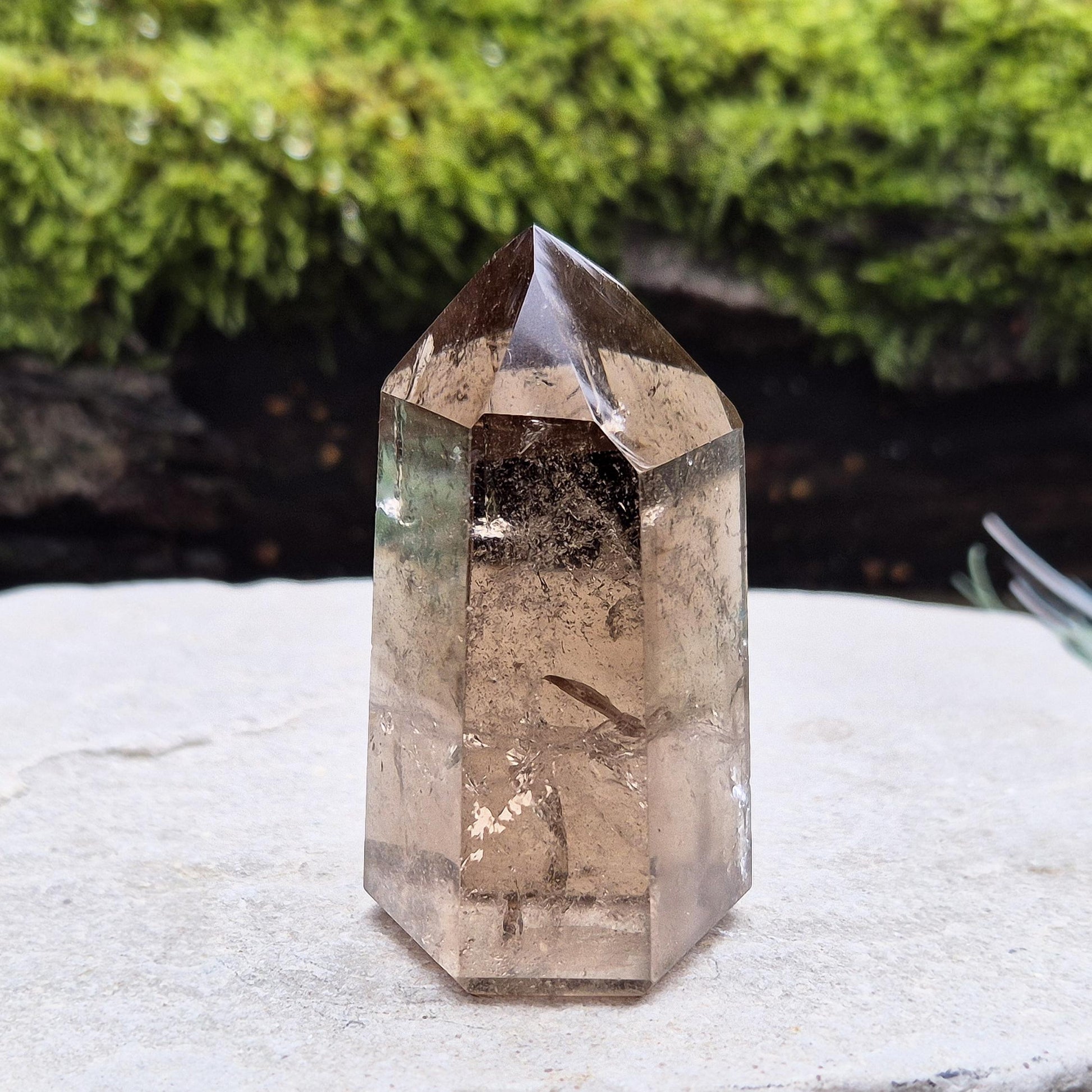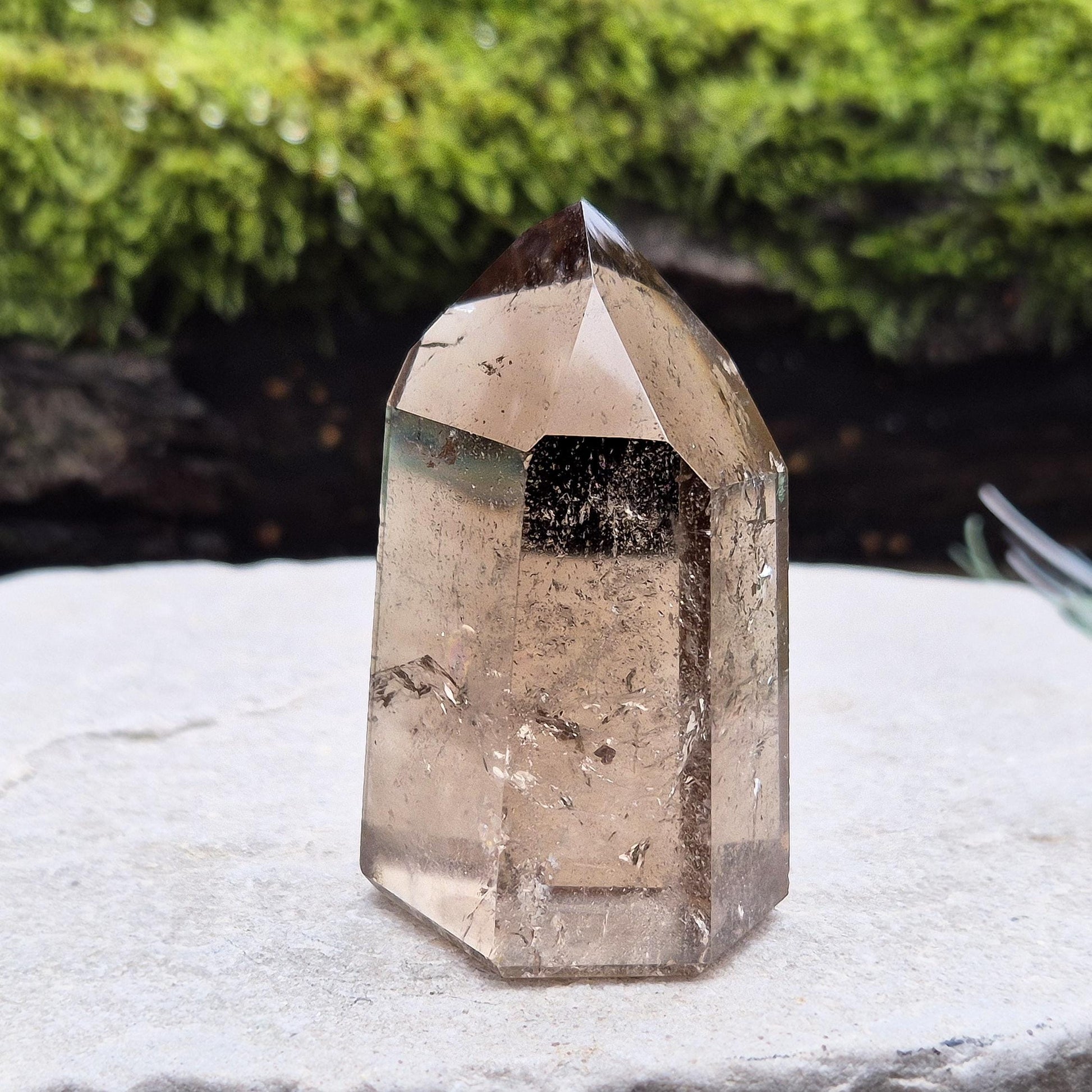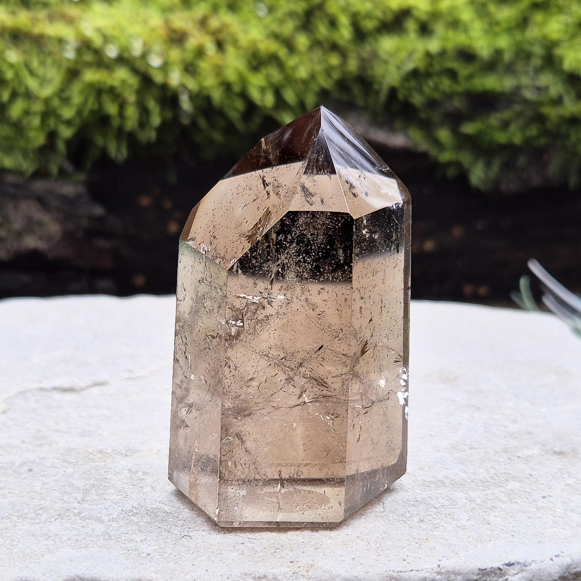 Smoky Quartz Point from Brazil. Natural dark Smoky Quartz polished point. This point has been cut and polished in Brazil. This piece has light reflecting and wispy inclusions. This is natural smoky quartz, not heat treated.