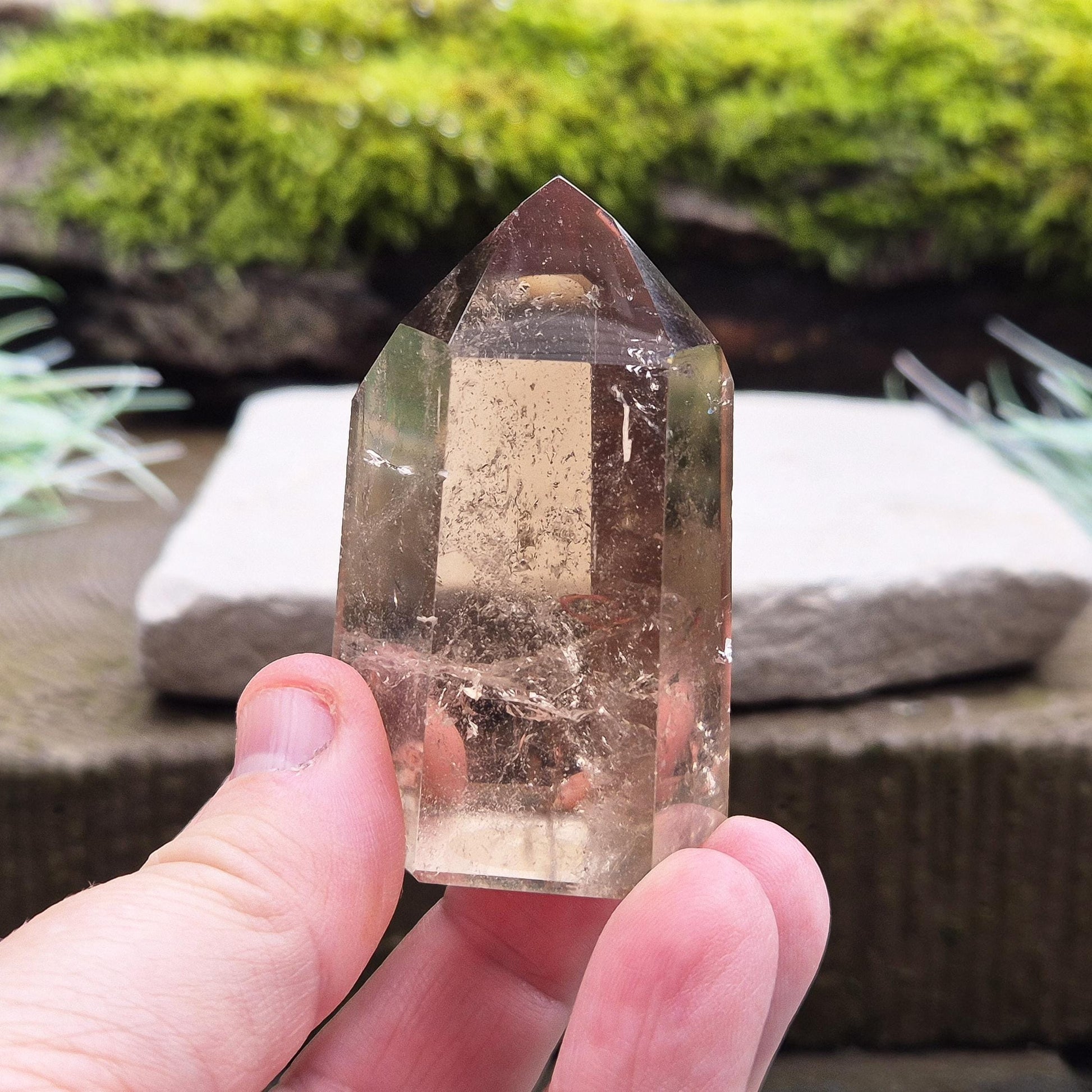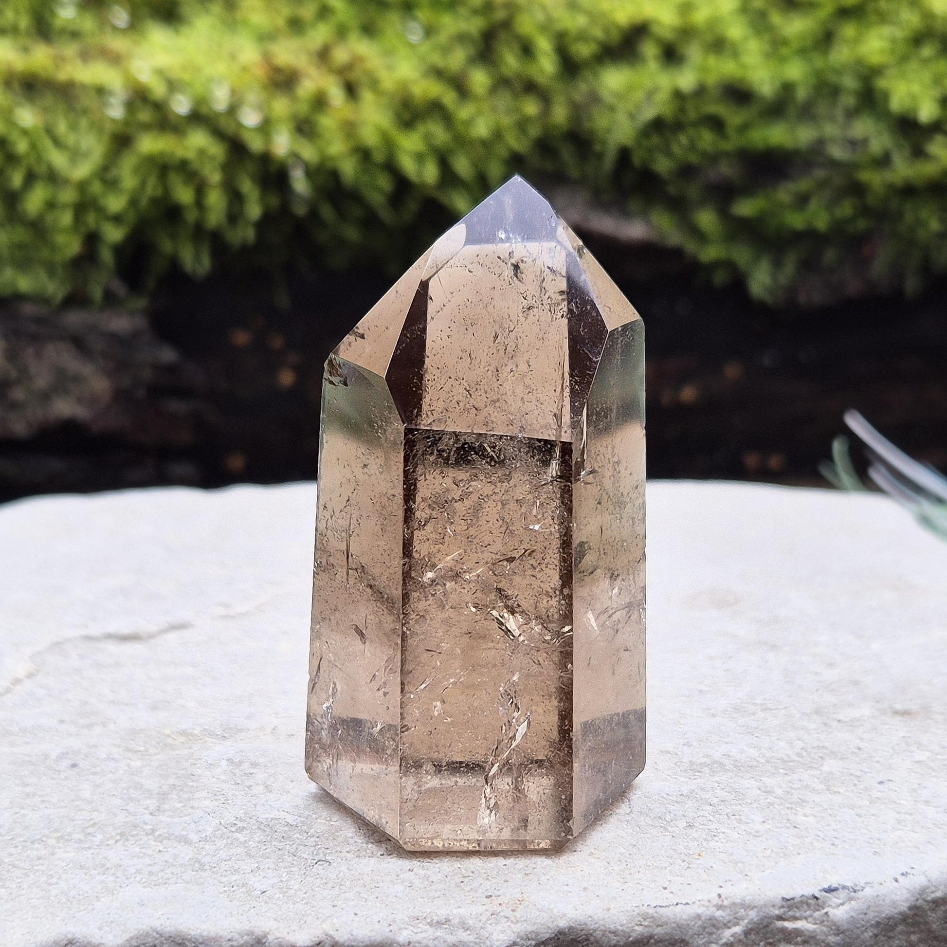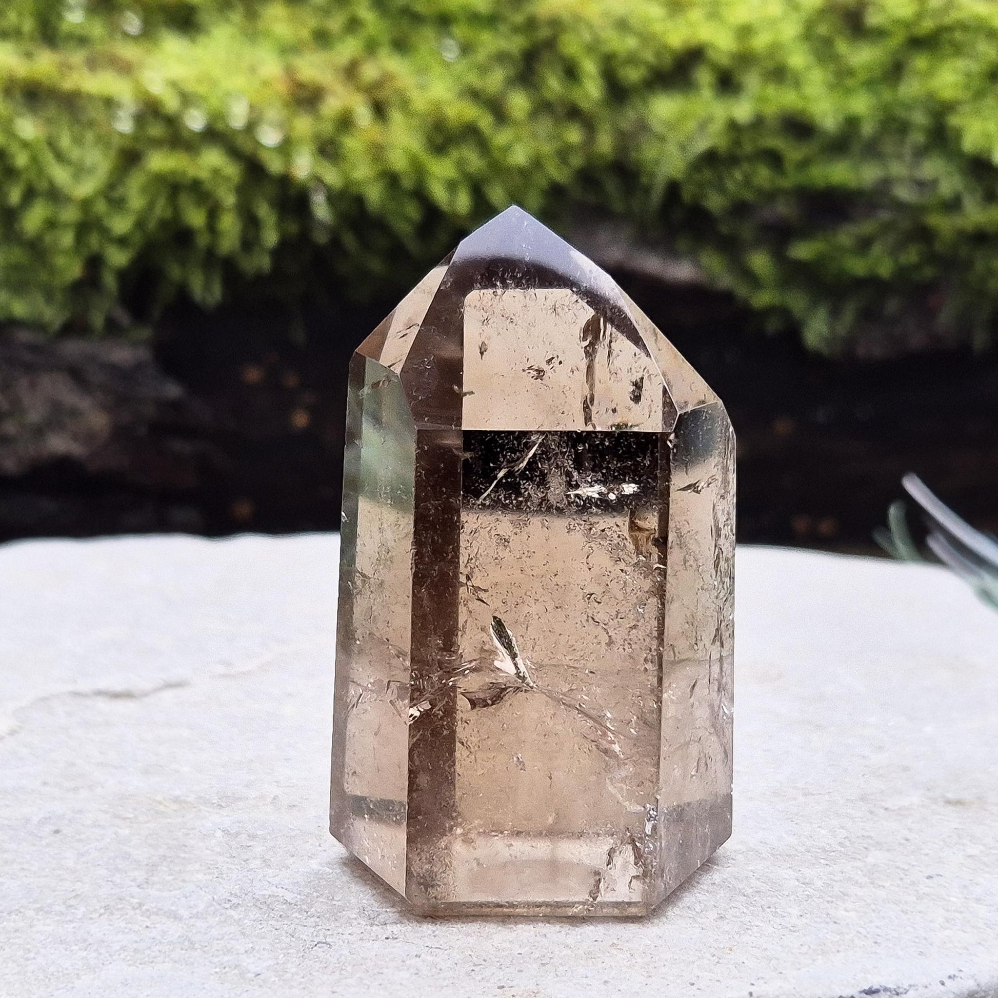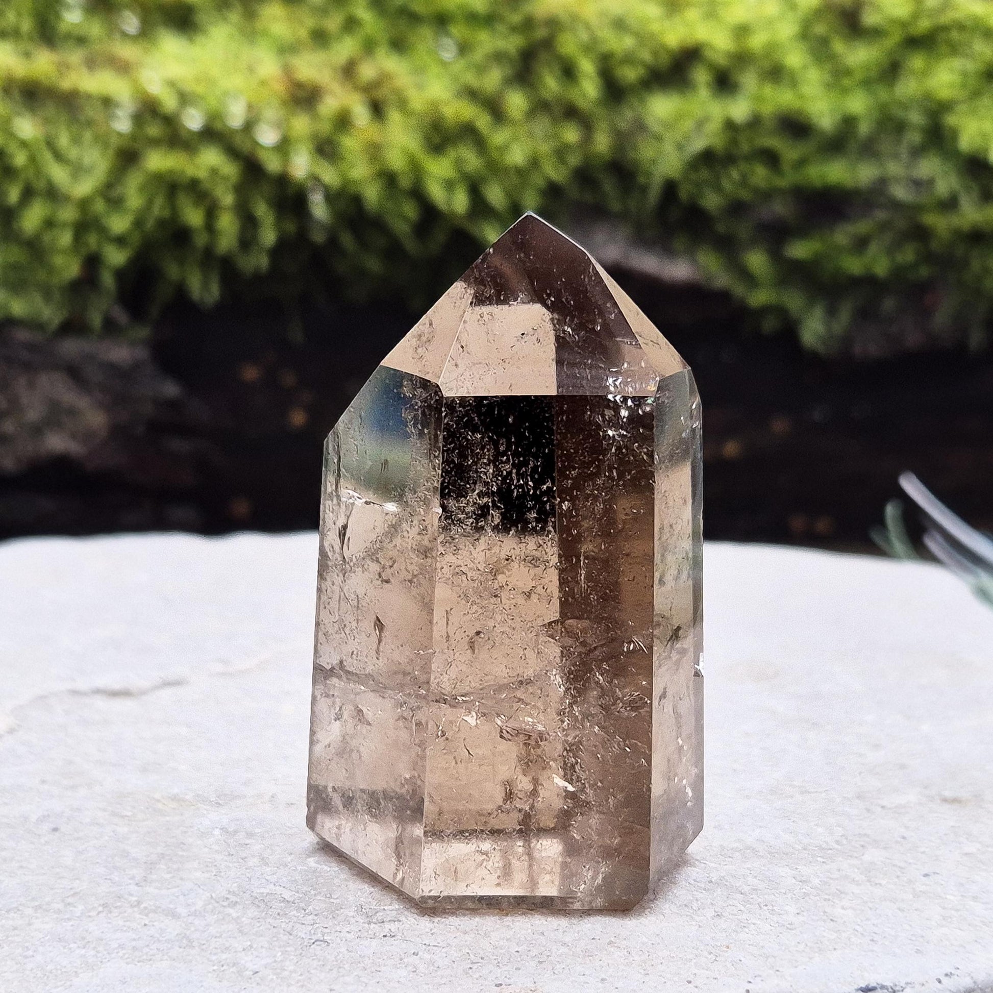 Smoky Quartz Point from Brazil. Natural dark Smoky Quartz polished point. This point has been cut and polished in Brazil. This piece has light reflecting and wispy inclusions. This is natural smoky quartz, not heat treated.