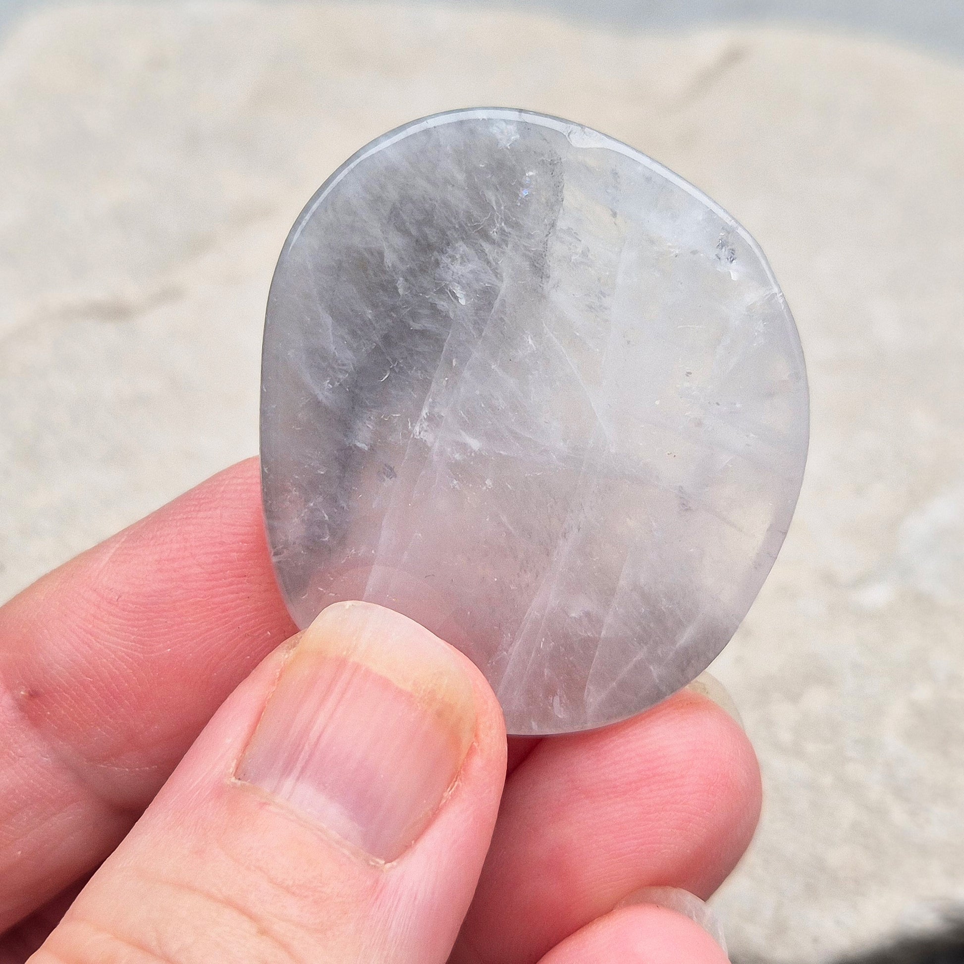 Lunar Quartz Palm Stone, also known as Lunar Rose Quartz, comes from Namibia. It is a blend of Rose Quartz and Graphite, creating unique color variations ranging from light grey to darker shades with pink hues. Each piece contains both Rose Quartz and Graphite, with some being more pink and others more grey.