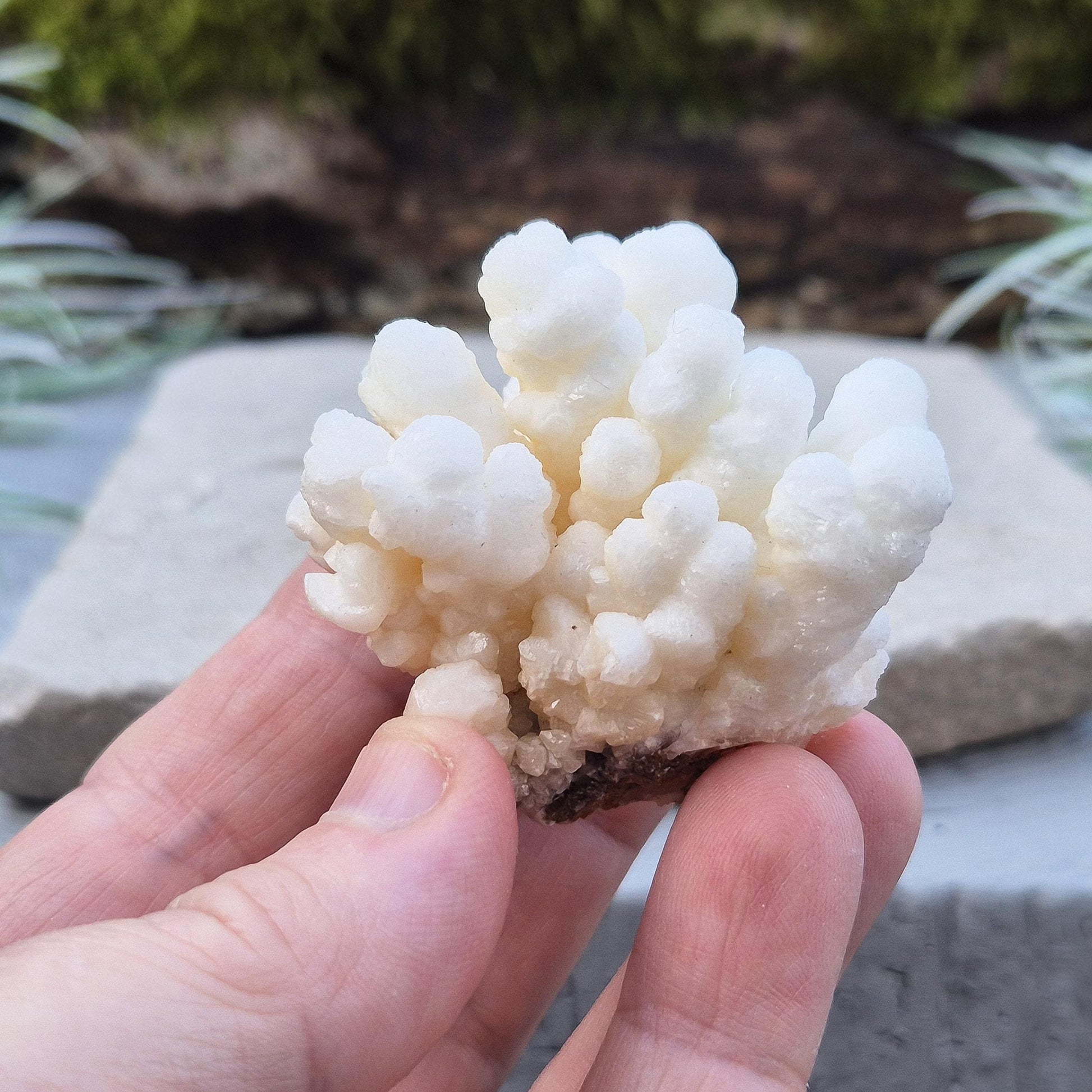 This lovely Cave Calcite crystal (also known as Cave Popcorn or Coralloid) is a natural form of aragonite, not true calcite. It features soft botryoidal shapes and this particular piece has a milky white colouring.