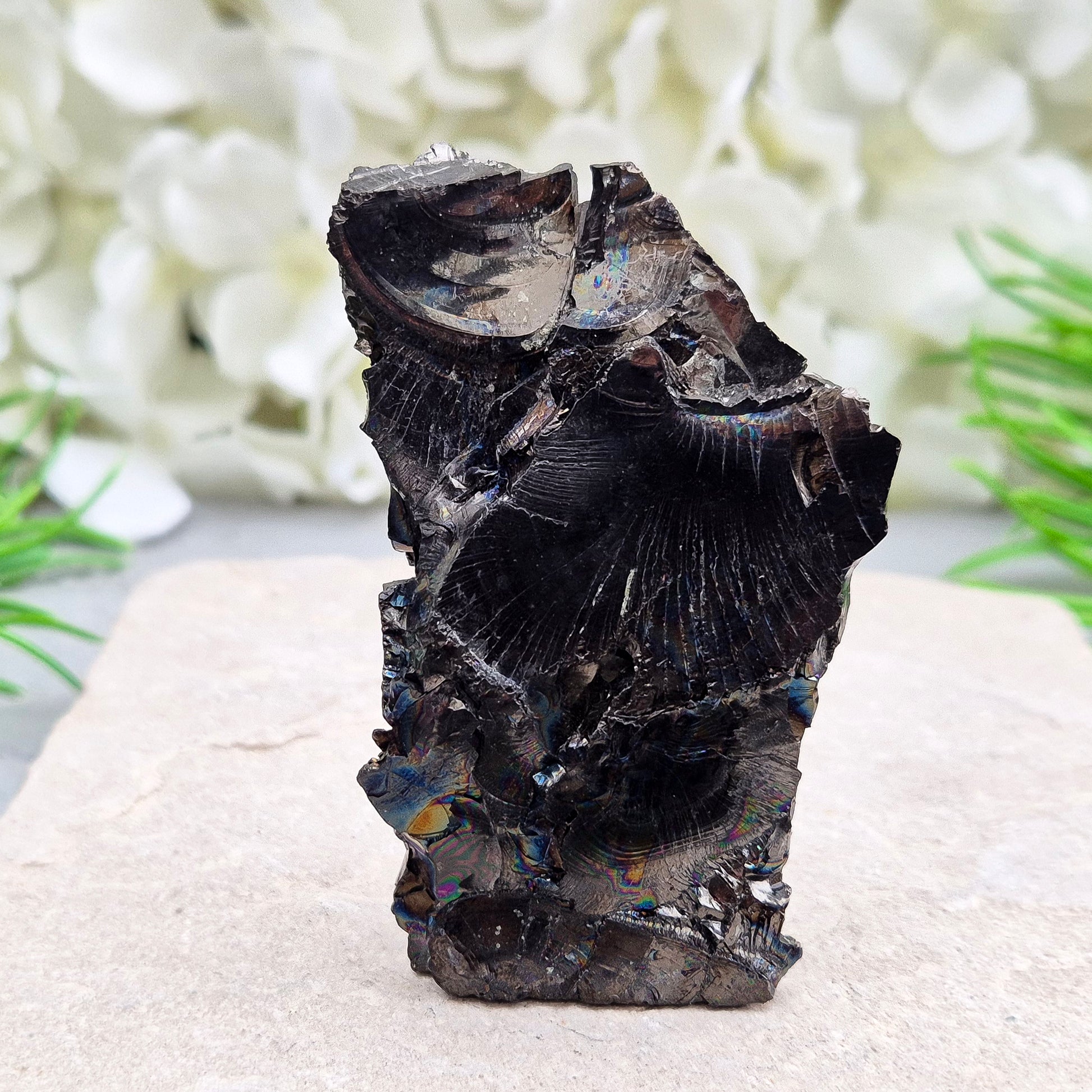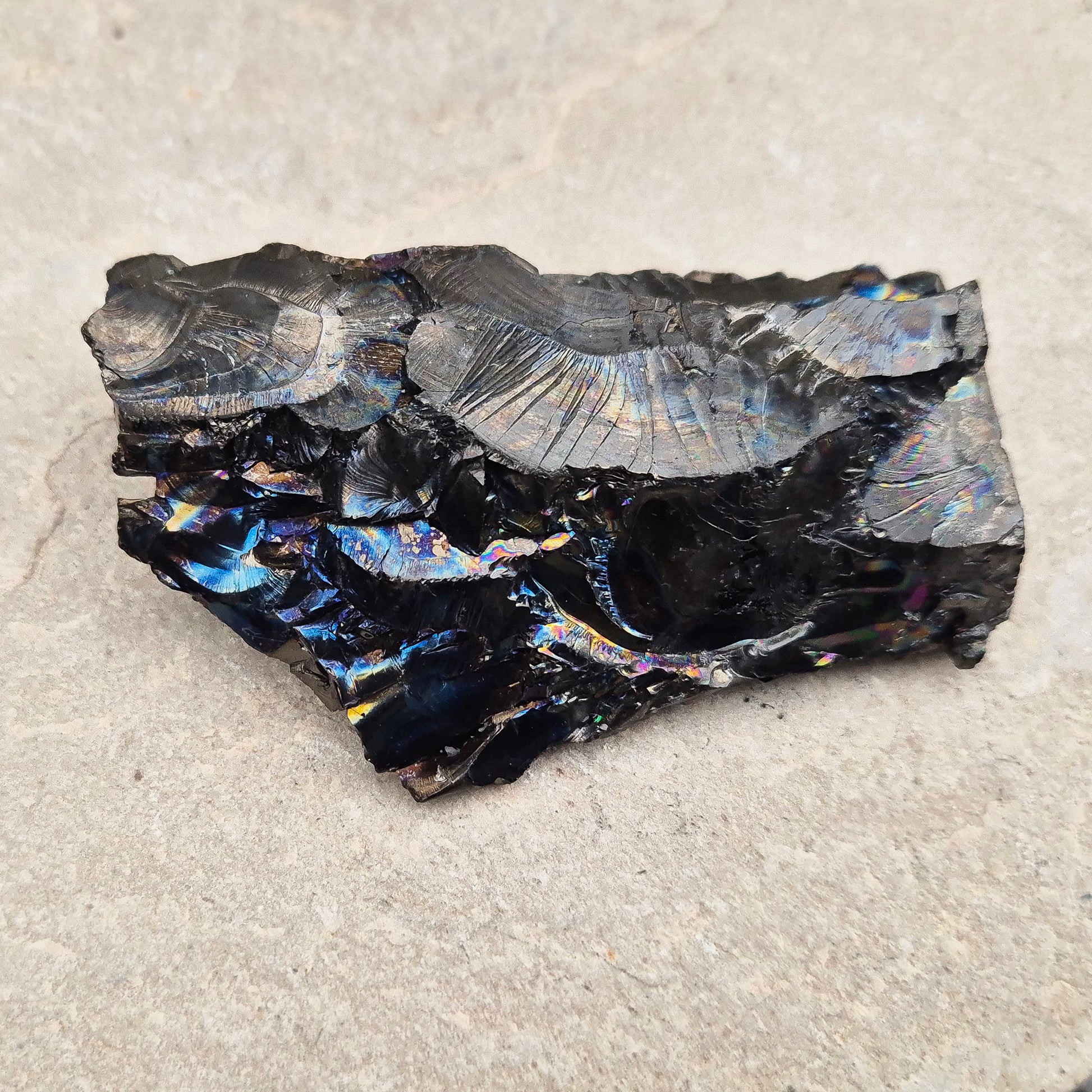 Many pieces from this deposit show a natural rainbow iridescence when the light hits the surface — a thin, naturally formed film created during the stone’s formation. This gives the stone an unusual, oil-slick shimmer while still keeping that deeply grounding black body colour.
