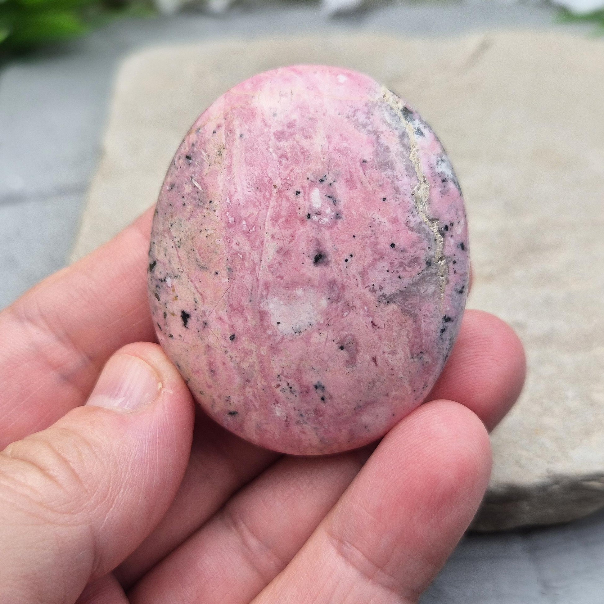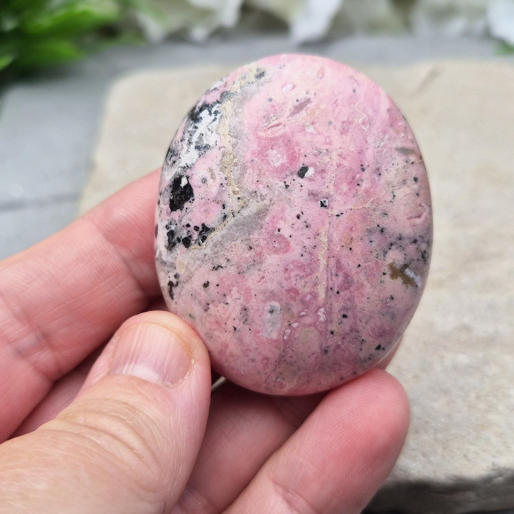Pink Rhodonite Crystal Palm Stone – also known as Bubblegum Pink Rhodonite from Peru. This beautiful Rhodonite crystal, sometimes nicknamed Bubblegum Pink Rhodonite, comes from Peru and features a soft pink colour with black patches caused by the natural oxidation of manganese.