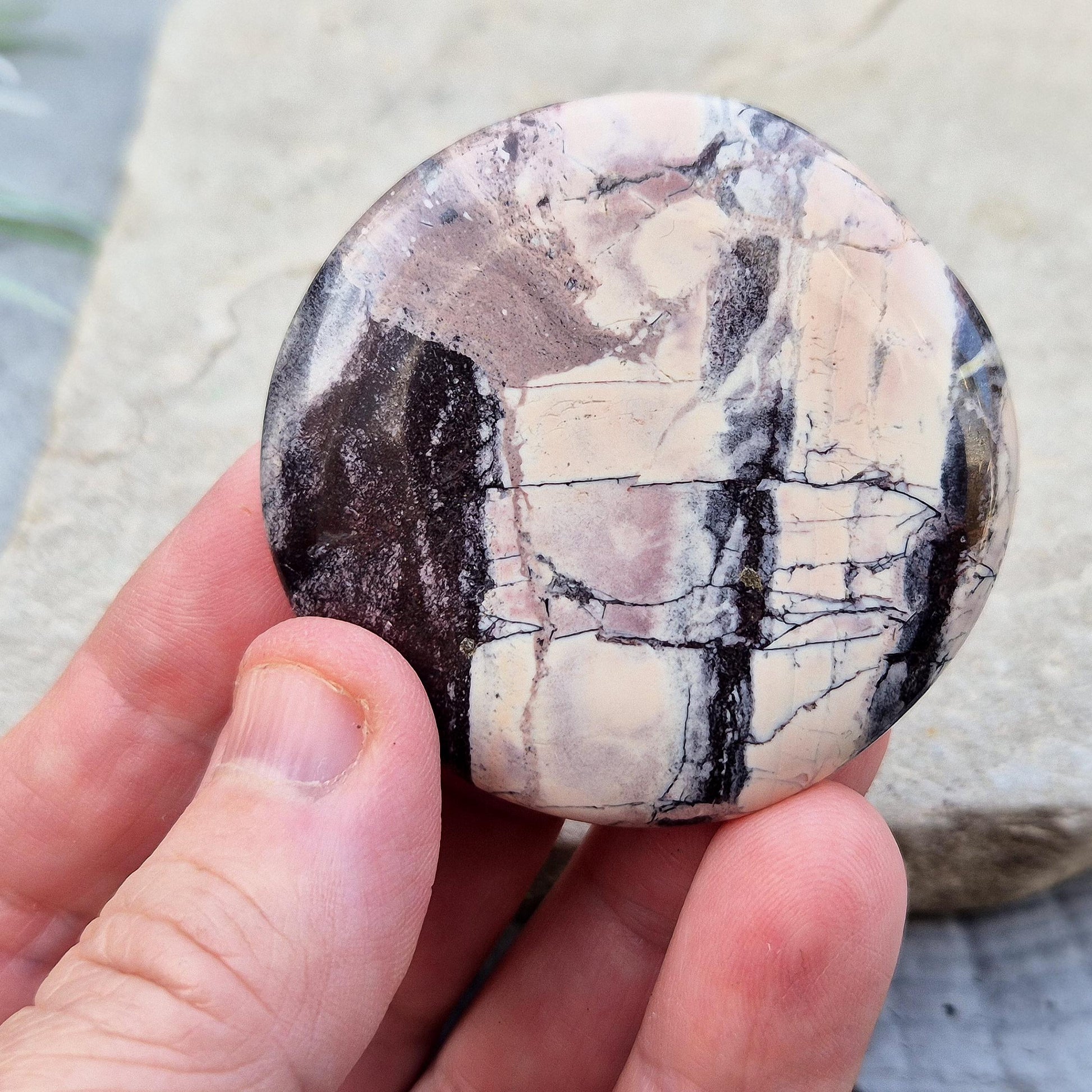 Porcelain Jasper Crystal Palm Stone, also refered to as "Exotica Jasper," is a type of jasper that typically features a smooth, porcelain-like texture. The colours can range from various shades of pink, mauve, grey, and white, sometimes with wonderful veining and swirling patterns giving each piece a unique appearance.
