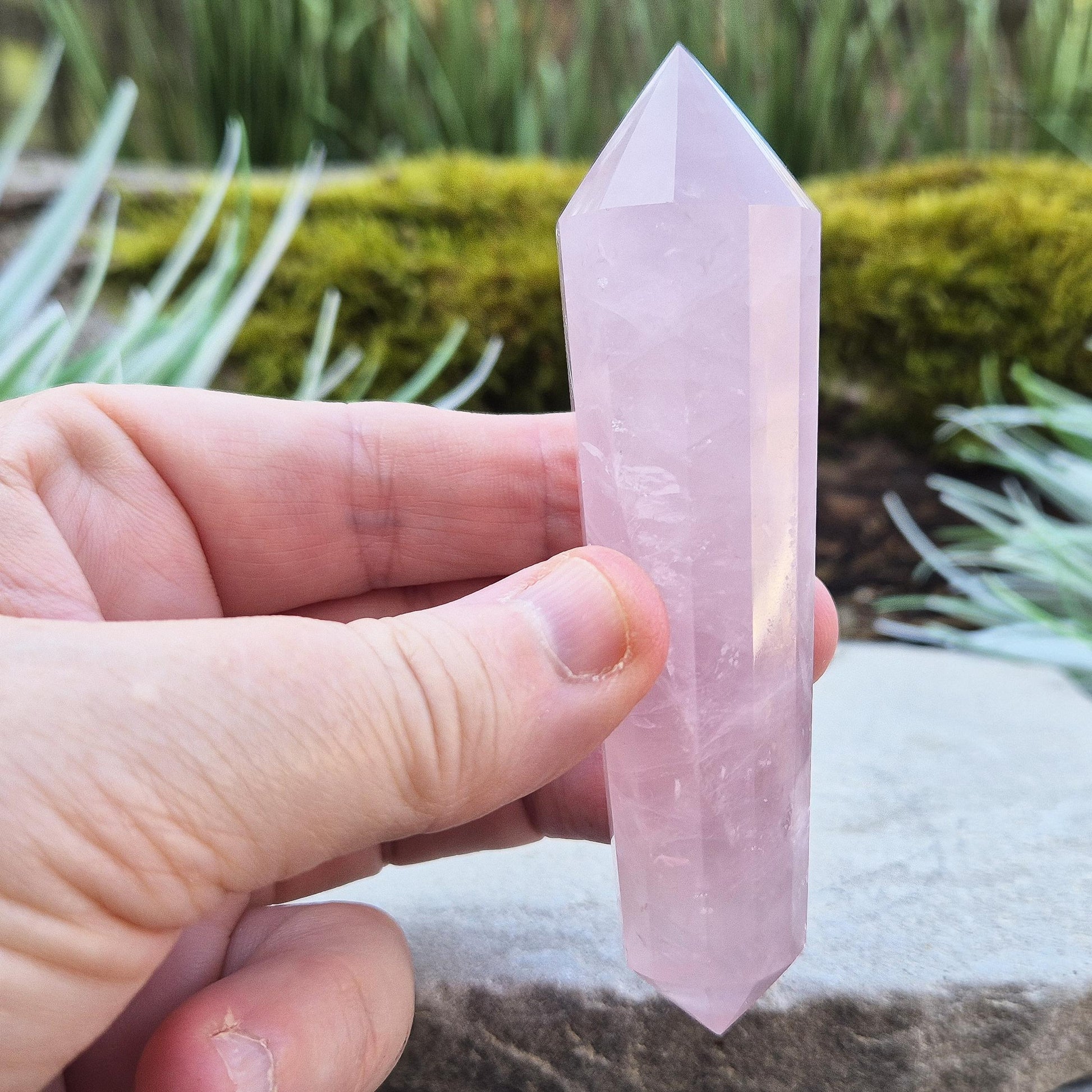 Rose Quartz Vogel Cut Double Terminated Wand. This beautifully carved Rose Quartz wand features a 12-sided Vogel cut and double termination, with one end slightly larger. Its soft pale pink colour and precise shaping make it ideal for focused energy work involving love, healing, and balance.