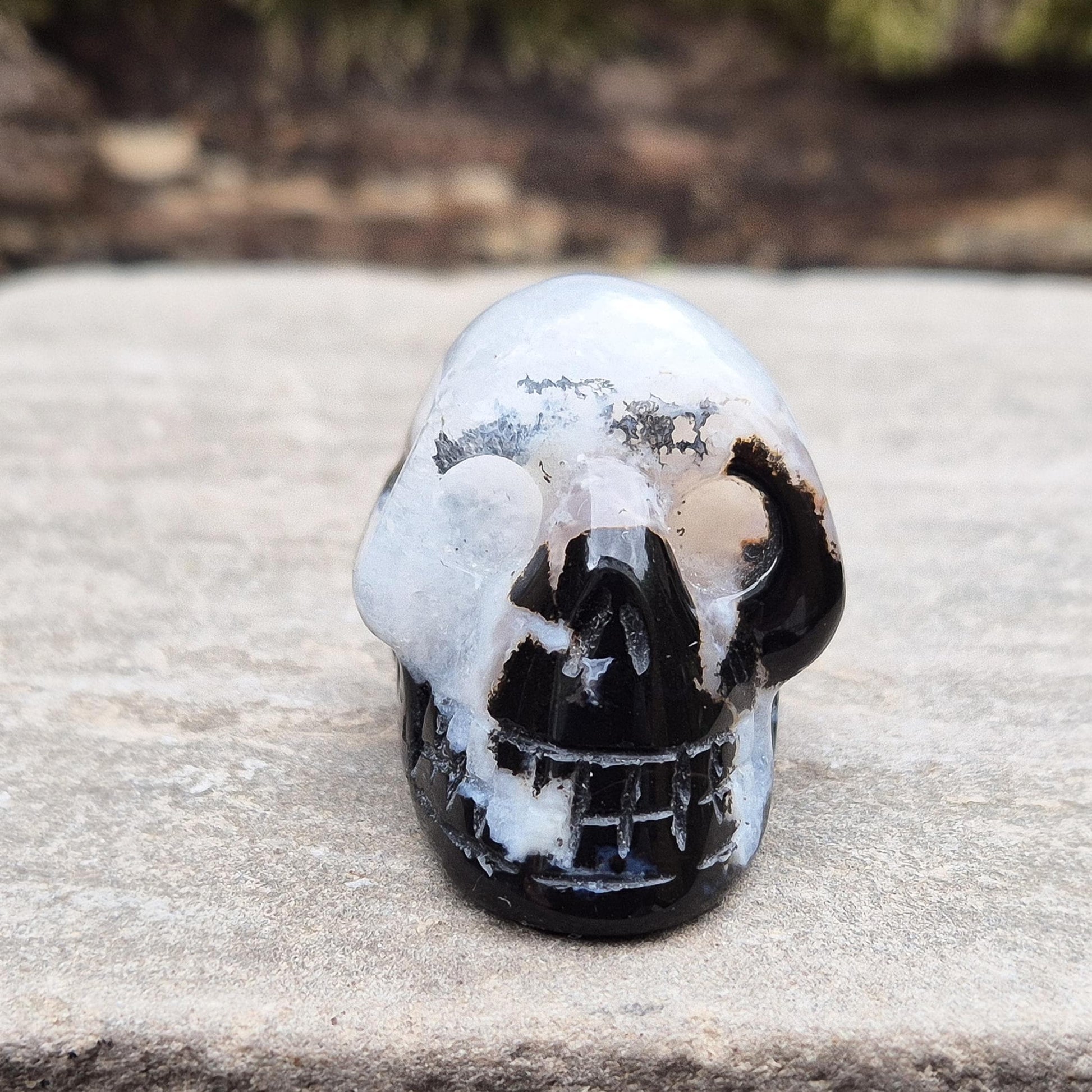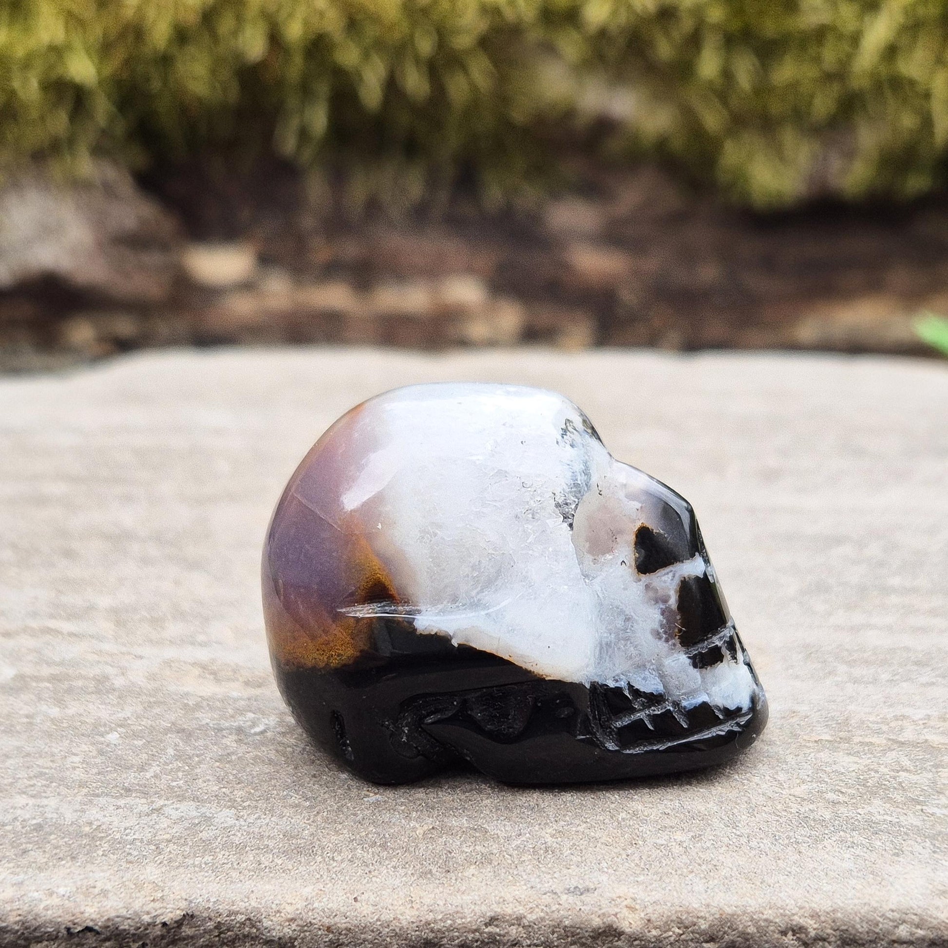 Polished Sardonyx and Jasper Skull from Brazil. Beautiful natural colours highlight both minerals. Perfect for altar displays, meditation, journaling, or adding a unique touch to ritual and grid setups.