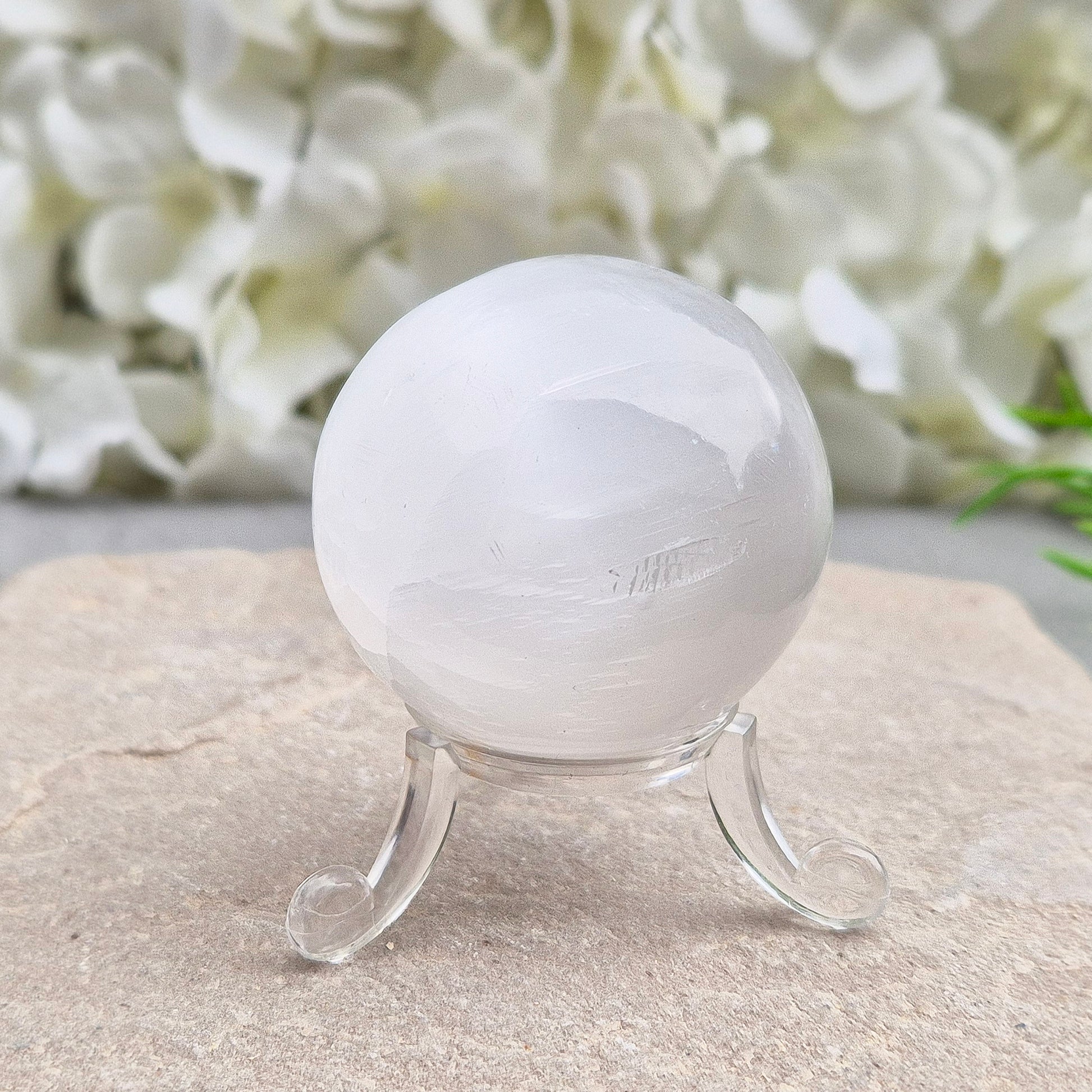 Selenite Crystal Sphere, Crystal Ball 4.5 cm diameter, Clear Acrylic Stand Included