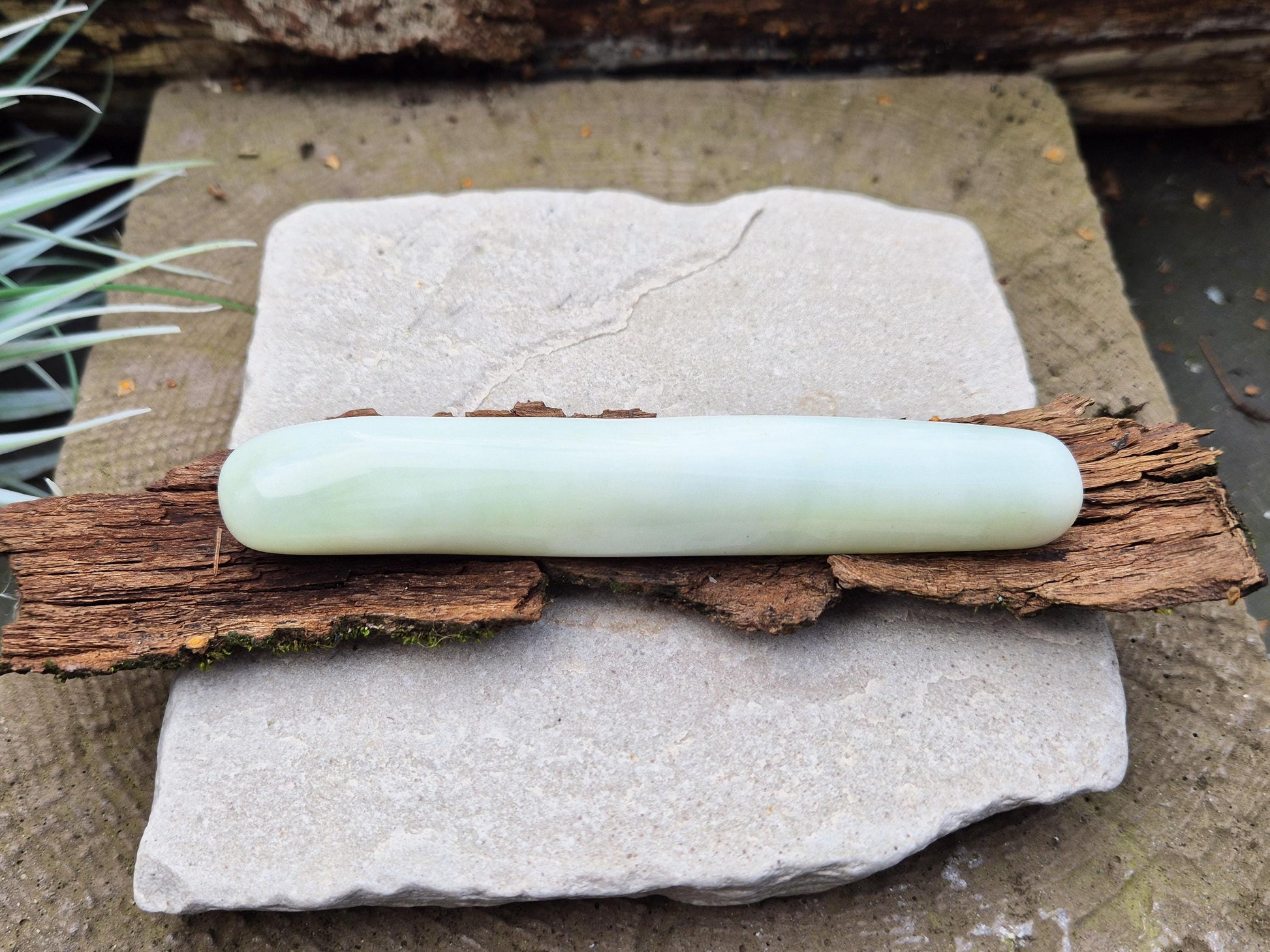 Serpentine Crystal Wand. This smooth, pale green Serpentine wand, often called New Jade, features gently rounded ends and a soothing texture.