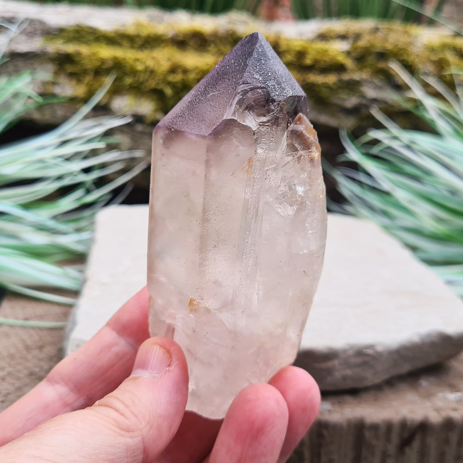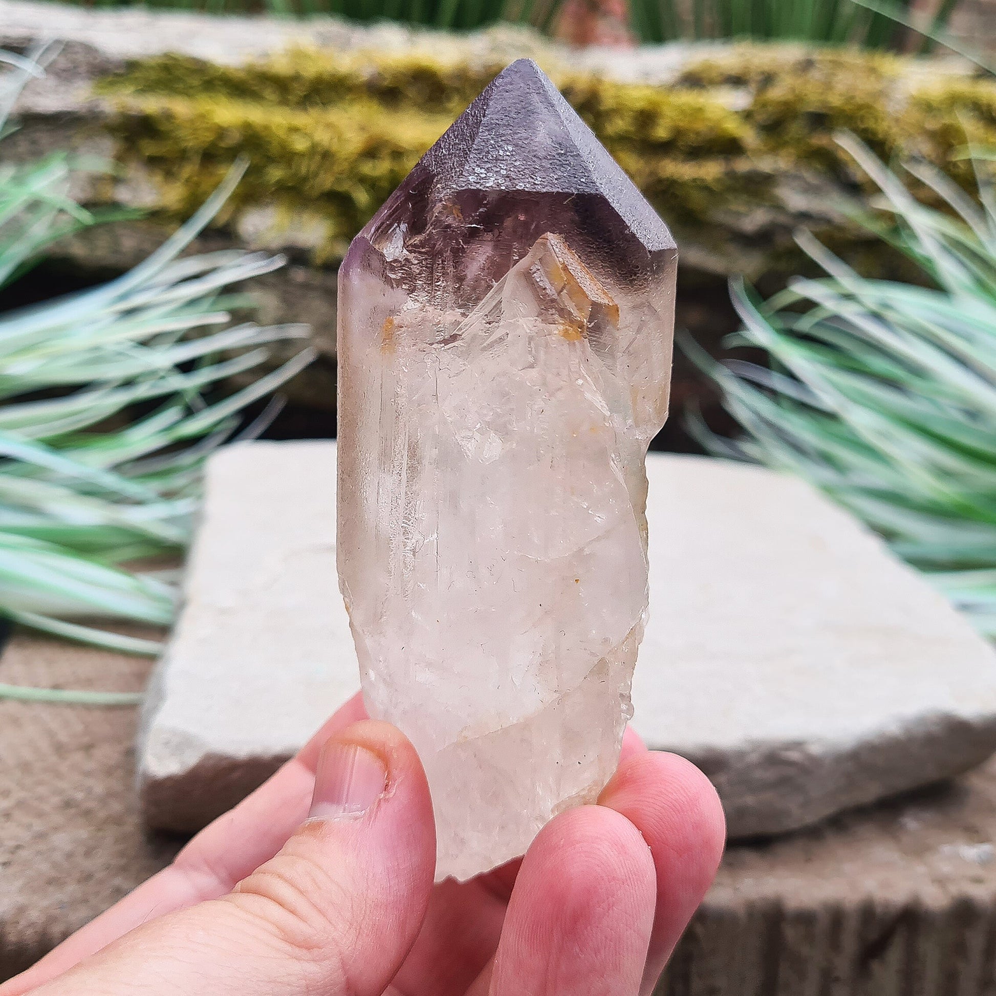Madagascan Quartz and Amethyst Crystal Point. Madagascan Quartz with Amethyst combines the clear, steady strength of Quartz with Amethyst’s calm, reassuring energy. It’s a supportive crystal for staying balanced, thinking clearly, and managing emotional stress with more ease — ideal for when you want to feel grounded, focused, motivated, and regain your sense of self.