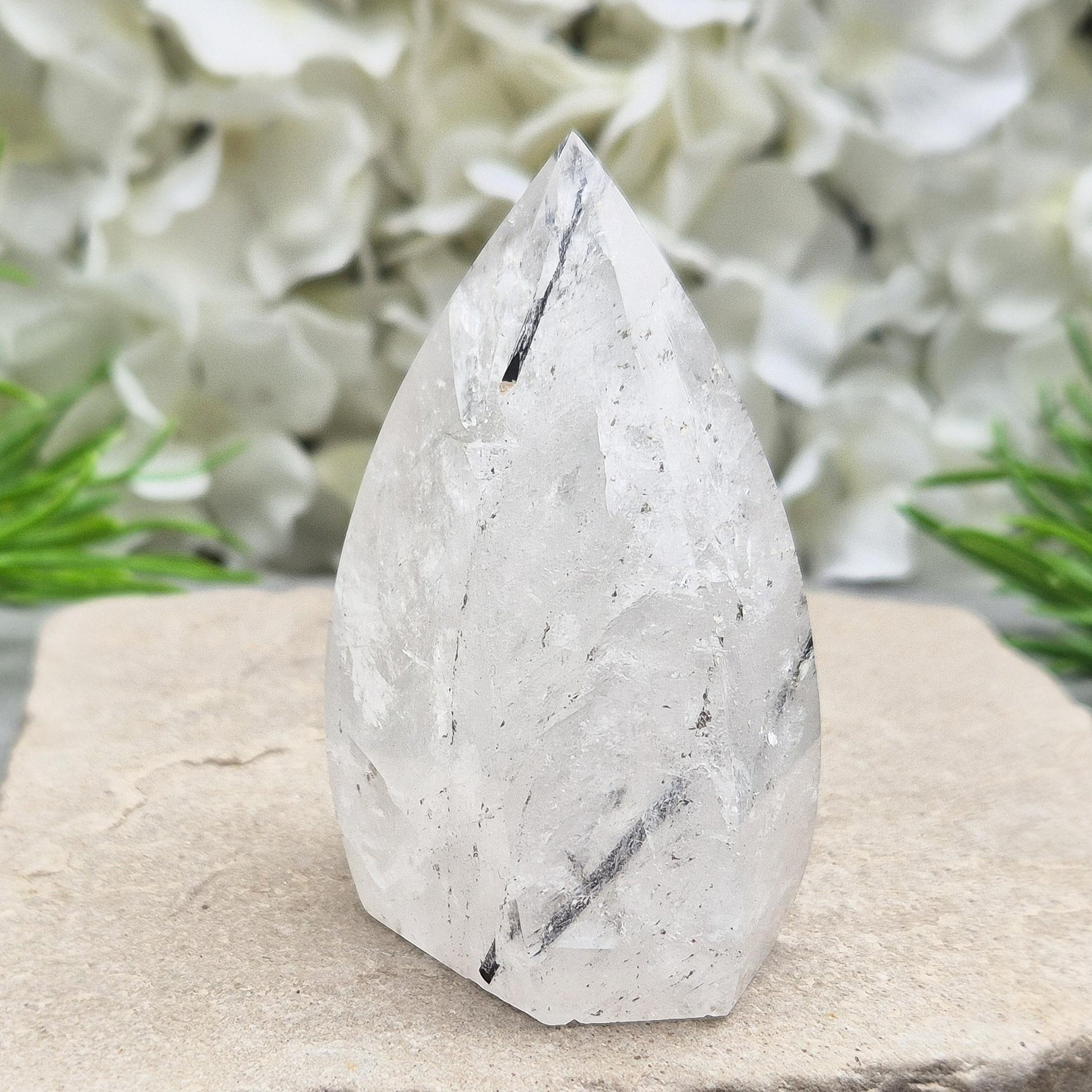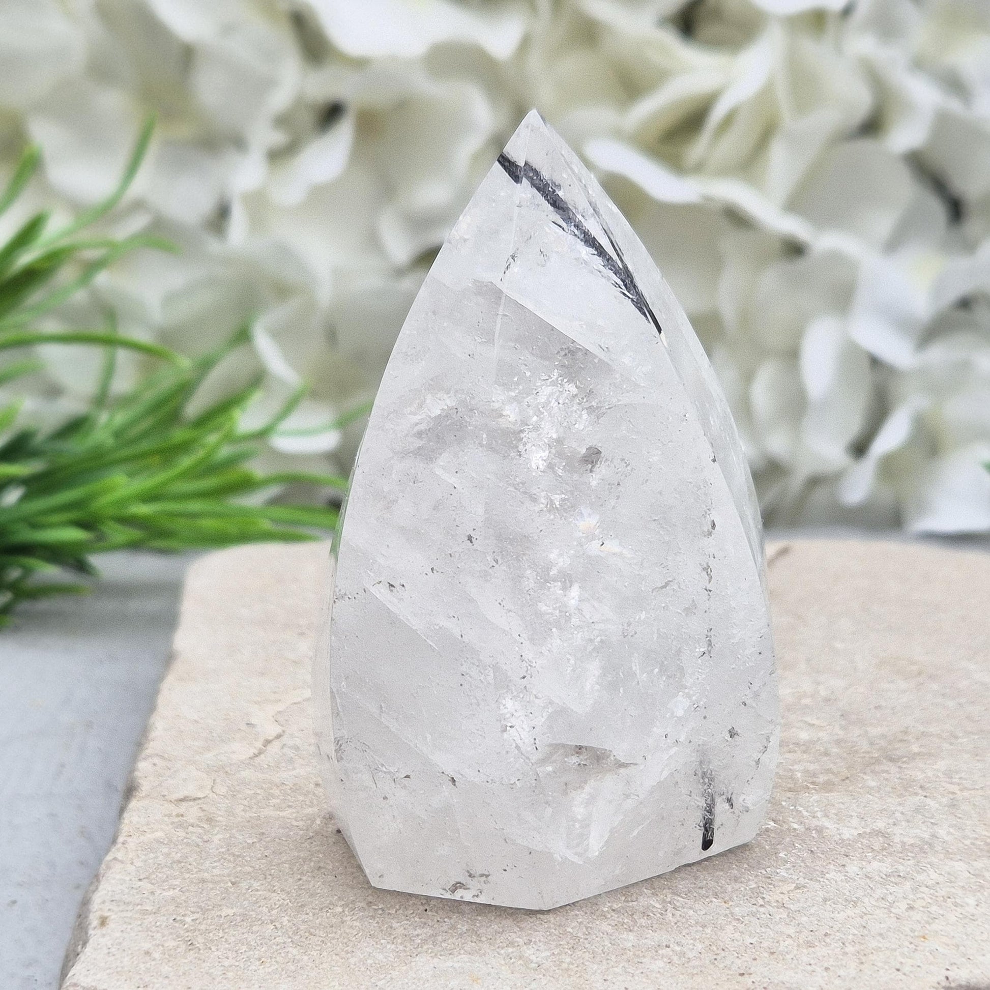 This striking Tourmalinated Quartz flame from Brazil blends the amplifying energy of clear Quartz with the grounding, protective qualities of Black Tourmaline. It helps you stay centred, protects your energy, and helps you stay focused in everyday tasks and also connect with your intuition.